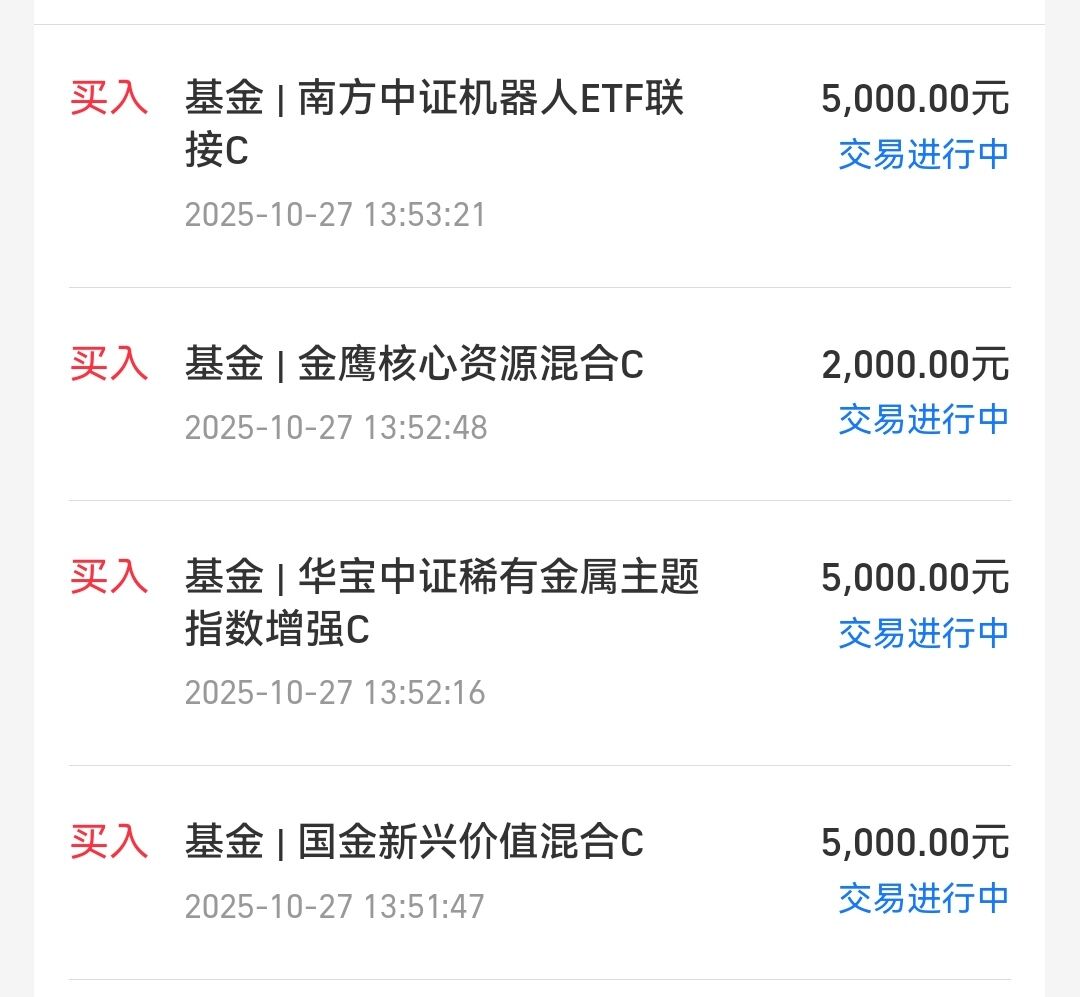我今天加仓了半导体材料设备、港股通科技、机器人、金鹰核心资源、稀有金属、国金新兴价值,其它基金继续持有待涨。