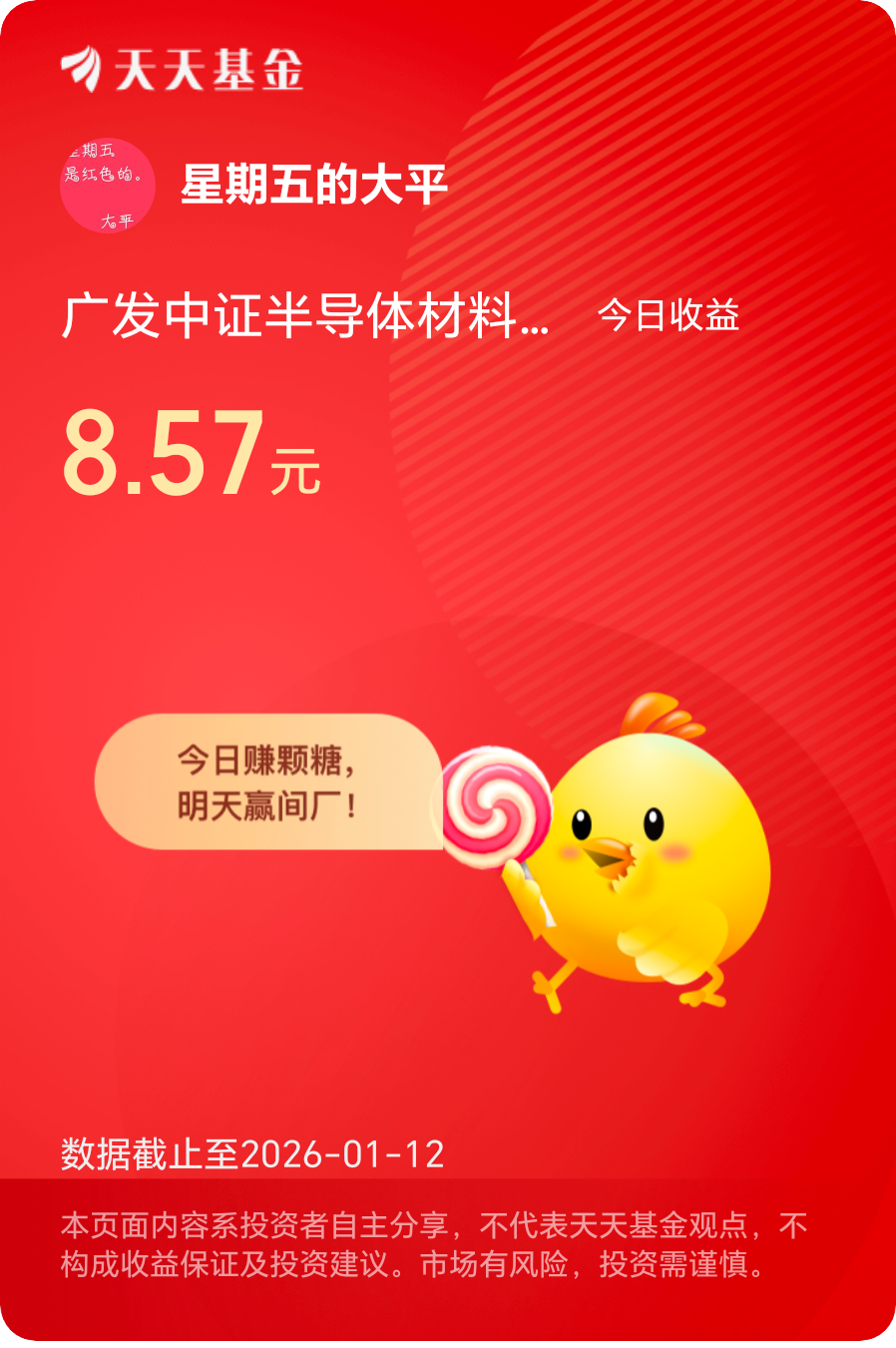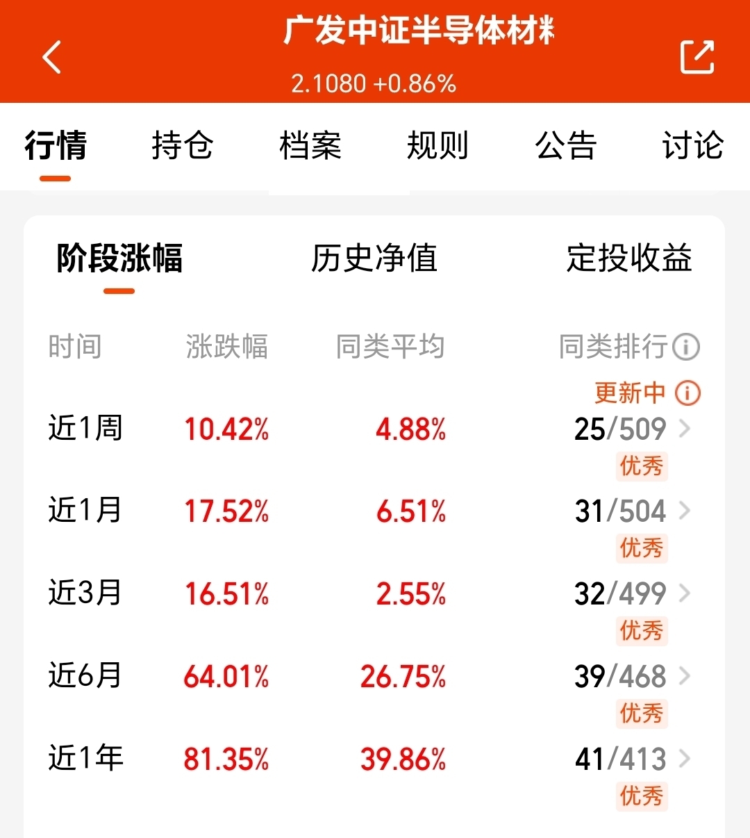 $广发中证半导体材料设备ETF发起式联接C$ 今天收涨0.86%,又创历史新高了,太给力了。