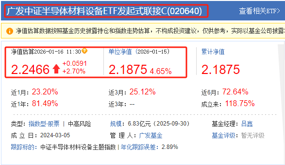 今日早盘,在台积电最新公布2025年四季度超预期财报的带动下,半导体产业链自昨日起强势拉升半导体板块集体冲高。这只专盯上游国产替代核心的半导体设备、材料领域$广发中证半导体材料设备ETF发起式联接C$(020640),盘中净值再度大涨2.7%,近一年涨幅超过80%。