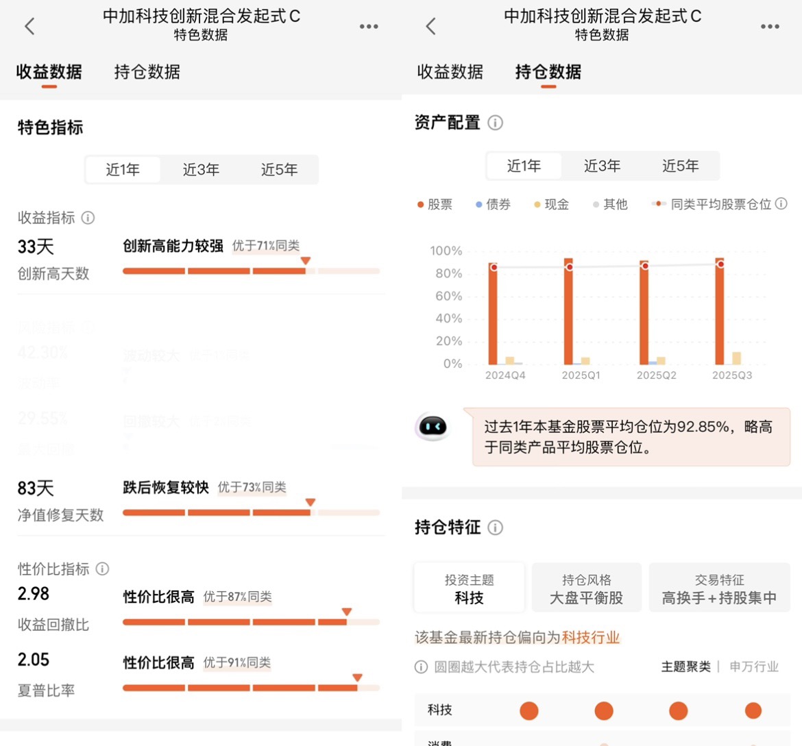 第五个原因,性价比是真高,风险收益比甩同类一大截。你看它的夏普比率2.05,收益回撤比2.98,都优于90%以上的同类基金——意思就是,每承担一份风险,能拿到的收益比别人多不少。虽然最大回撤有29.55%,看着有点吓人,但这是科技基金的通病,而且它跌了之后恢复得特别快,净值修复天数才83天,比73%的同类都强,跌下去能很快涨回来,这才是真的“抗造”。