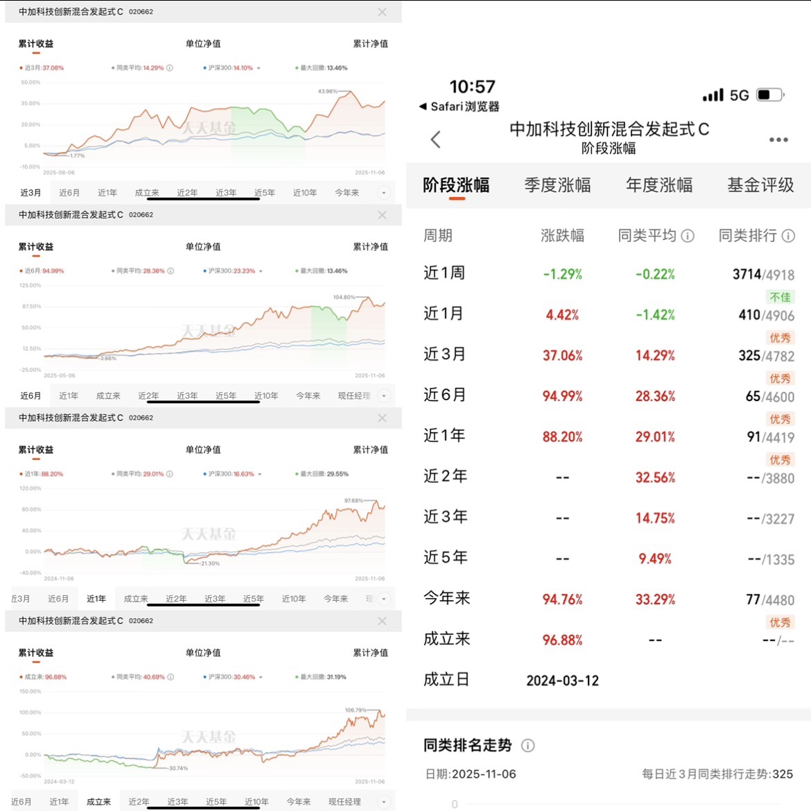 第一个原因,业绩是真能打,拿数据说话才靠谱。你看这基金成立才一年多,近一年收益干到88.20%,今年以来更是飙到94.76%,成立至今都快翻倍了——96.88%的收益,这在同类基金里直接杀进前2%,就这爆发力,赶上AI行情来的时候,简直是坐着火箭往上冲。而且不光是涨得多,涨得还稳,近三个月涨了37.06%,近六个月94.99%,一路突突突往上走,就没怎么掉链子,这种“持续吃肉”的感觉,谁买谁知道爽。