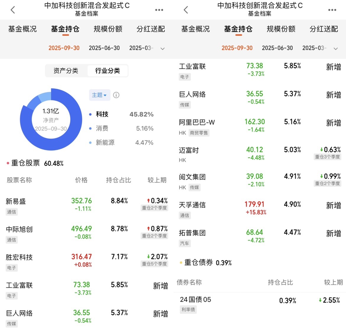 第六个原因,规模小反而灵活,船小好调头。现在基金规模才0.84亿,刚好卡在“既能重仓优质标的,又不会因为规模太大买不进小票”的区间。你想啊,要是规模上了几十亿,想买中际旭创这种盘子大的还行,但要是碰到一些弹性大的中小盘科技股,根本买不了多少,收益就得打折扣。但这基金不一样,规模小,基金经理想调仓换股,今天决定了明天就能动,能精准跟上行业轮动,比如最近加仓算力、减仓传媒,动作快得很。