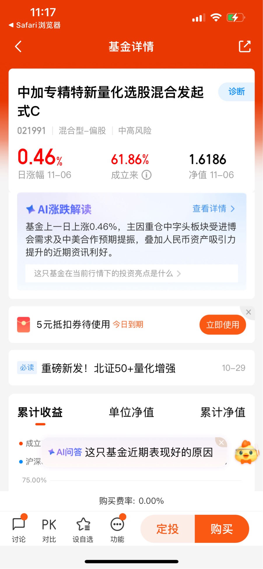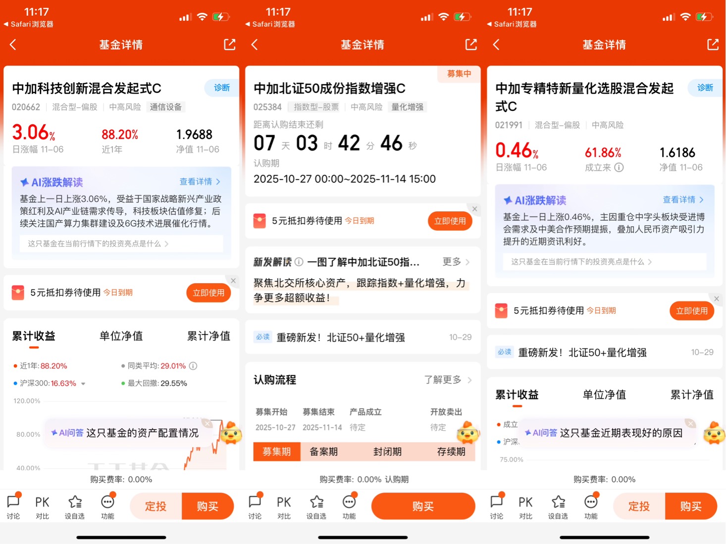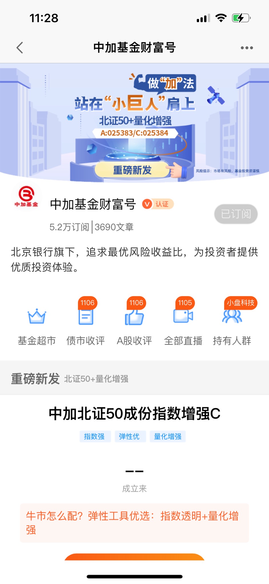 一一一喜欢指数打底、求稳又想赚超额的,中加北证50成份指数增强C可以闭眼入。它跟着北证50指数走,满仓都是北交所的核心资产,高新技术企业一抓一大把,本身就踩中了科技主线。再加上量化增强策略帮忙,跌的时候能少亏点,涨的时候还能比指数多赚点,是牛市里稳妥的弹性配置。