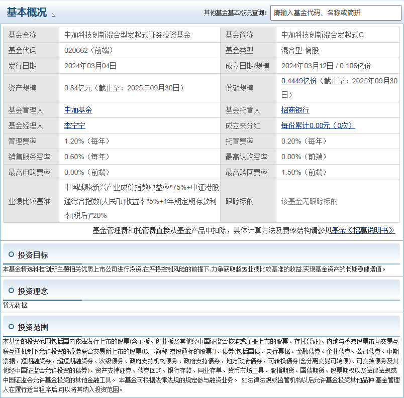 中加科技创新混合发起式C成立于2024年3月12日,业绩比较基准为中国战略新兴产业成份指数收益率75% + 中证港股通综合指数(人民币)收益率5% + 1年期定期存款利率(税后)20%,基金经理是李宁宁,任职期内收益17.65% 。截至2024年12月31日,该基金规模0.02亿元,环比增加540.16%。