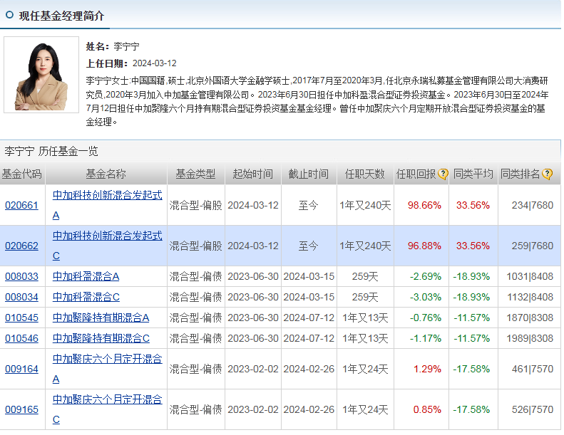 从业绩数据来看,中加科技创新混合发起式C(020662)表现亮眼。该基金近1月收益达到4.42%;近3月收益达到37.06%;近6月收益达到94.99%;近1年收益达到88.2%;近年来收益达到94.76%。从2024年3月12日成立至今,涨幅已经达到了96.88%。短中长期表现均超越同类型平均水平,业绩较为稳定。这说明该基金在市场中有较强的盈利能力和抗风险能力,就像一个优秀的运动员,在不同的比赛中都能取得好成绩3。