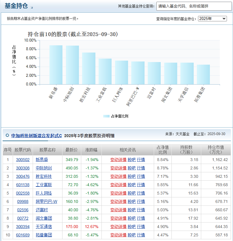 $中加科技创新混合发起式C$ 从持仓来看,该基金的重仓股集中在科技领域,像胜宏科技、新易盛、仕佳光子等。随着科技的不断发展,科技创新企业具有很大的成长空间,有望带来较高的投资回报。比如人工智能、机器人、半导体等领域,在未来的发展前景都非常广阔。就拿人工智能来说,现在已经广泛应用于各个行业,提高了生产效率和生活质量,相关企业的业绩也可能会随之增长。