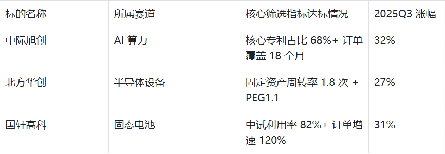 赛道属性:聚焦技术颠覆性领域,当前核心覆盖 AI 算力、先进半导体、人形机器人、固态电池等四大方向。典型标的包括 AI 领域的中际旭创、寒武纪,半导体领域的北方华创、中微公司,均具备 “技术迭代驱动业绩爆发” 的底层逻辑。