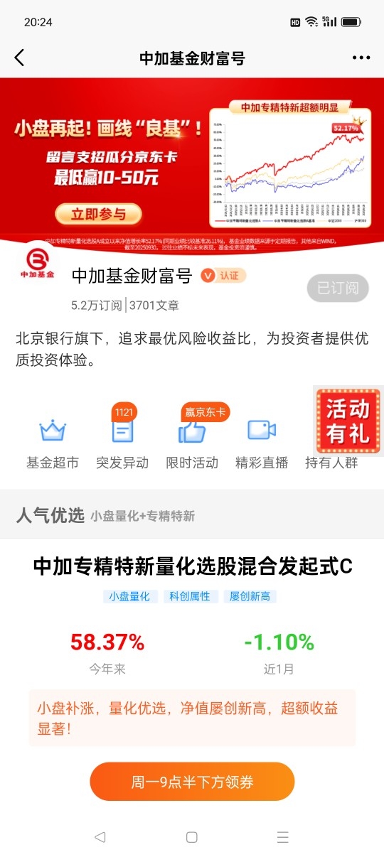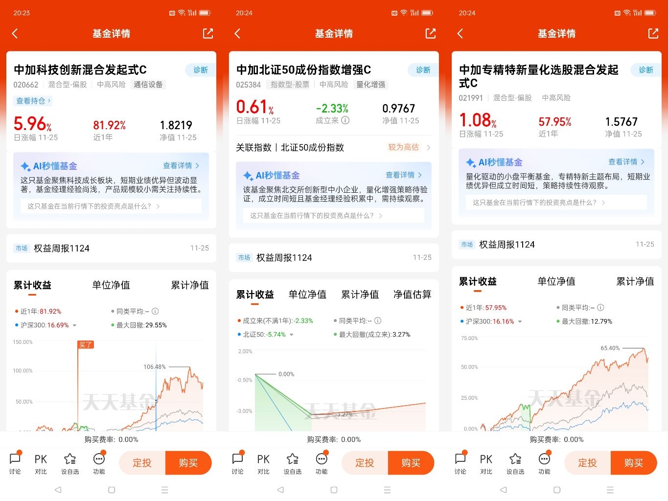 三、中加基金公司投研实力强,无论是固收产品,还是权益产品,都有非常亮眼的表现,如$中加专精特新量化选股混合发起式C$ $中加北证50成份指数增强C$ ,都值得关注;@中加基金李宁宁 经理擅长AI、芯片等成长领域 ,挖掘个股弹性机会,从业以来年化回报26.74%,非常值得信赖!@中加基金