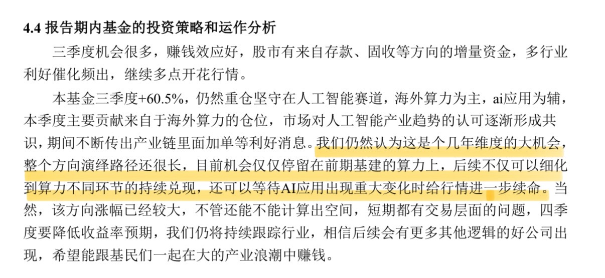 当然,选主动管理型基金,说白了很大程度上就是选基金经理这个人,看他的眼光准不准,定力够不够。所以我个人特别看重基金定期报告里那个“报告期内基金投资策略和运作分析”的部分。这就像基金经理的“工作笔记”和“思想汇报”,能看出他是不是真的知行合一,说到做到。李宁宁经理在中加科技创新混合基金的2025年三季报里就写得明明白白:“我们仍然认为这是个几年维度的大机会,整个方向演绎路径还很长,目前机会仅仅停留在前期基建的算力上,后续不仅可以细化到算力不同环节的持续兑现,还可以等待AI应用出现重大变化时给行情进一步续命。” 这段话传递了几个关键信息:一是坚定看好科技成长的长期机会(战略定力);二是清晰地认识到当前行情主要还在算力等基础设施阶段(产业阶段判断);三是前瞻性地布局了应用端,等待应用爆发的“续命”行情(战术灵活性)。这种在波动中坚守核心逻辑——科技成长,又根据产业趋势适度调整布局的管理策略,我觉得正是投资科技这种高波动、高成长板块所必需的——既要有战略定力,又要有战术灵活性。查了一下,李宁宁经理管理这只基金一年多,尽管近期市场波动导致一些持仓股如新易胜短期下跌带来浮亏,但整体来看,截至2025年三季度,这只基金成立以来的收益表现还是相当不错的,A类份额累计收益率达到了惊人的83.90%,进一步证明了李宁宁经理的管理能力。