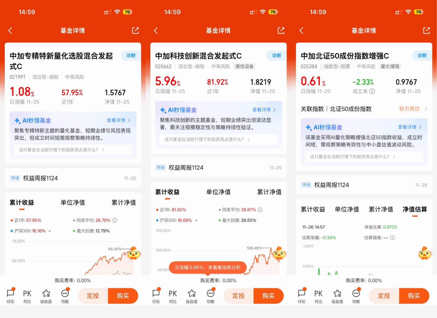 在业绩表现上,它也足够亮眼,中加科技创新混合基金作为一只深耕硬科技领域的主题基金,自2024年三月份成立以来,一年多的时间里,其A类份额累计收益率就已经高达83.90%,远超同期沪深300指数24.82%的涨幅,且较业绩比较基准超出42.33%,有力印证了基金经理李宁宁在科技行业机会挖掘方面的卓越才能。从中短期业绩观察,近六个月收益率为85.23%,近三个月收益率达8.32%,均显著超越同类基金及沪深300指数,业绩排名稳居优秀行列。这无疑是一只聚焦科技赛道的优质主题基金,非常值得我们关注布局!