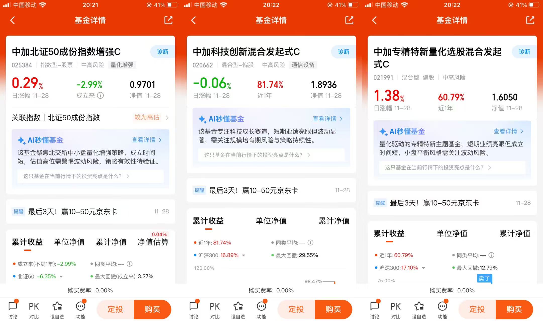 先说说为啥不选另外俩。$中加专精特新量化选股混合发起式C(OTCFUND|021991)$,全靠量化模型跑出来的票,前十大重仓没一个占比超1.3%,看着分散安全,可AI算力这种风口上的主线,太散了根本吃不到肉。$中加北证50成份指数增强C(OTCFUND|025384)$更不敢碰,投的全是北交所小票,招募书里列的风险能吓退半条街,中小企业波动大,我这普通散户真扛不住。
