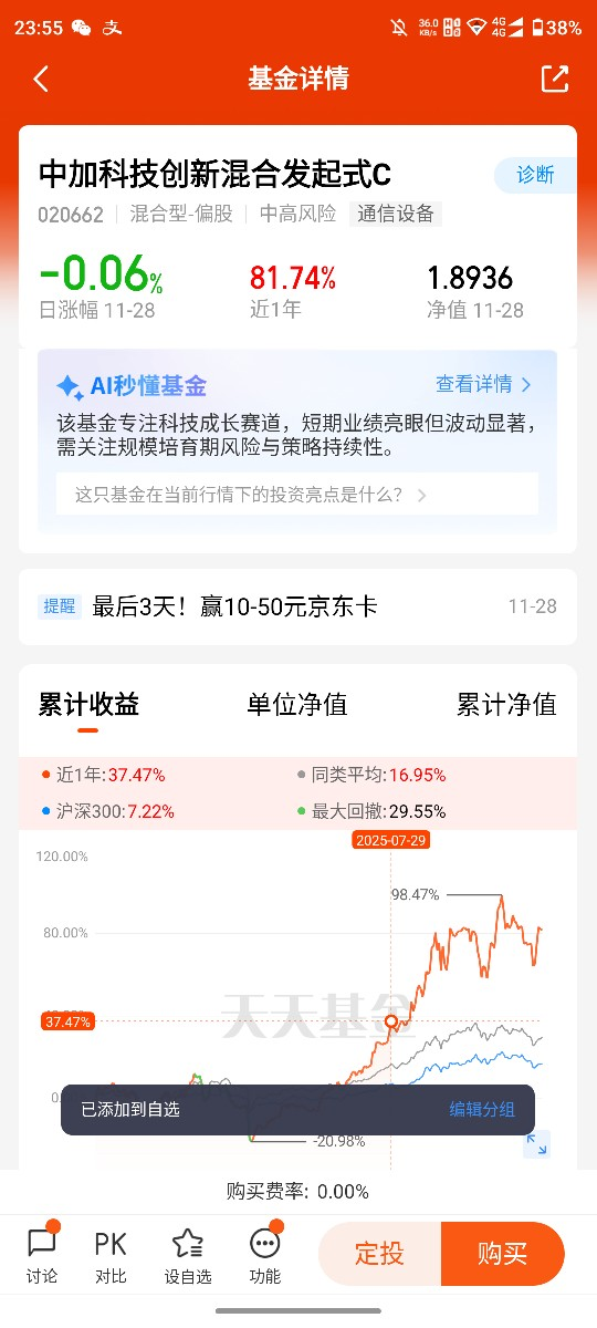 第三,它的“小”还体现在风险可控,适合普通投资者扛住波动。科技创新类资产本身有波动,但这只基金是混合基金,不会满仓押某一个细分方向,会适当搭配优质标的分散风险,比起纯小众题材的“小资产”,回撤没那么极端。而且C类份额没申购费,持有时间够了免赎回费,平时费用也不高,咱们小资金投入也不用心疼手续费,分批买、长期拿都合适,不用因为费用高或者波动大不敢下手。