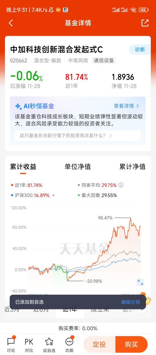 我选“科技硬核+成长确定”的小,中加科技创新混合C是优选