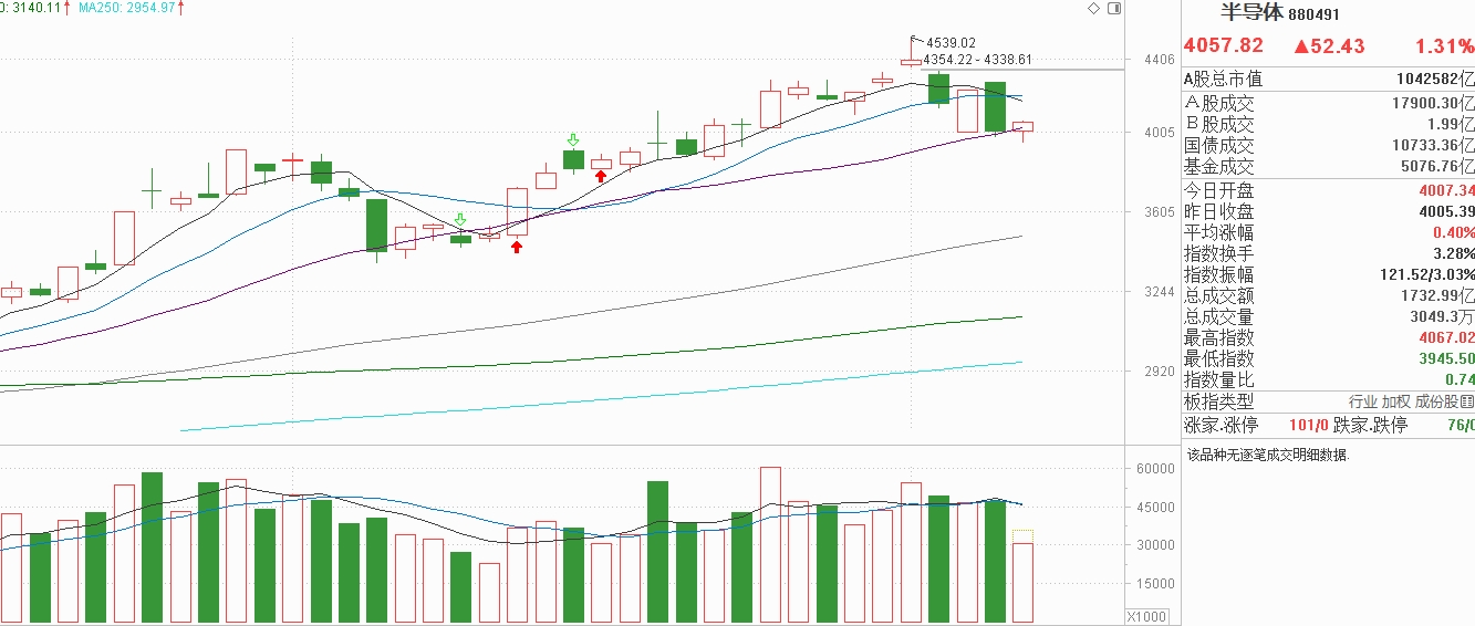 芯片昨天高开低走中阴调整把周一假阳线反包了,感觉抛压依然很大,但并没有失守20天