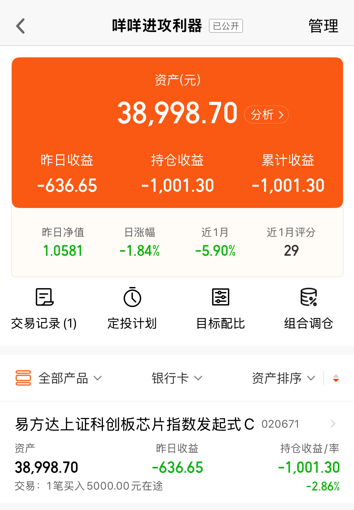 易方达上证科创板芯片指数发起式C在我组合中起到“进攻之矛”的角色,这只前十大重仓股占比超56%,海光信息、寒武纪等AI芯片龙头合计权重近20%,中芯国际、中微公司等国产替代核心标的悉数在列,既吃AI算力红利,又赚自主可控收益。龙头集中度高,因此业绩弹性也很强,近3月涨幅38.87%,近6月涨幅47.52%。