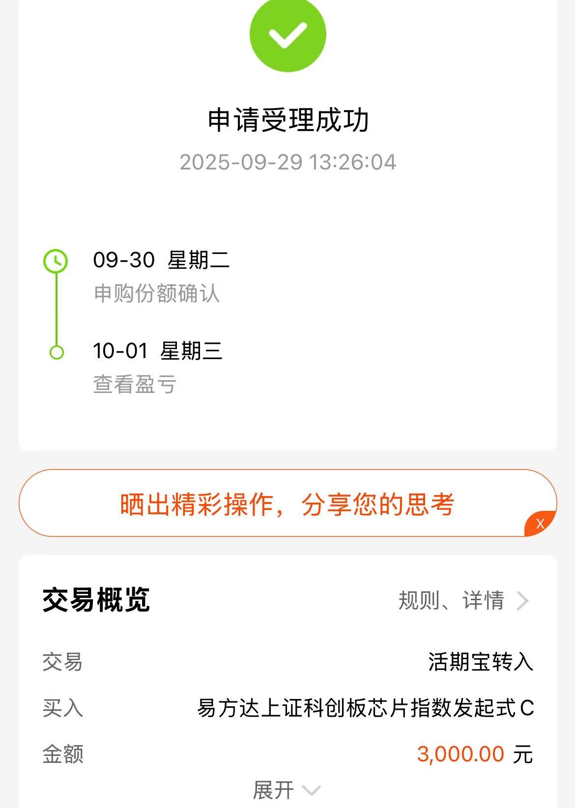 今天大盘拉升上涨,盘面是比较不错的,芯片现在也拉升翻红啦,活力比较强,英伟达注资OpenAL事件热度还是很高的,所以我觉得后续还能继续上涨。$易方达上证科创板芯片指数发起式C(OTCFUND|020671)$持仓高度聚焦创业板芯片赛道,分布均衡,近一个月涨幅8.44%,近三个月涨幅57.34%,近一年涨幅146.92%,业绩优秀,优于同类,我今天也分批慢慢布局起来!