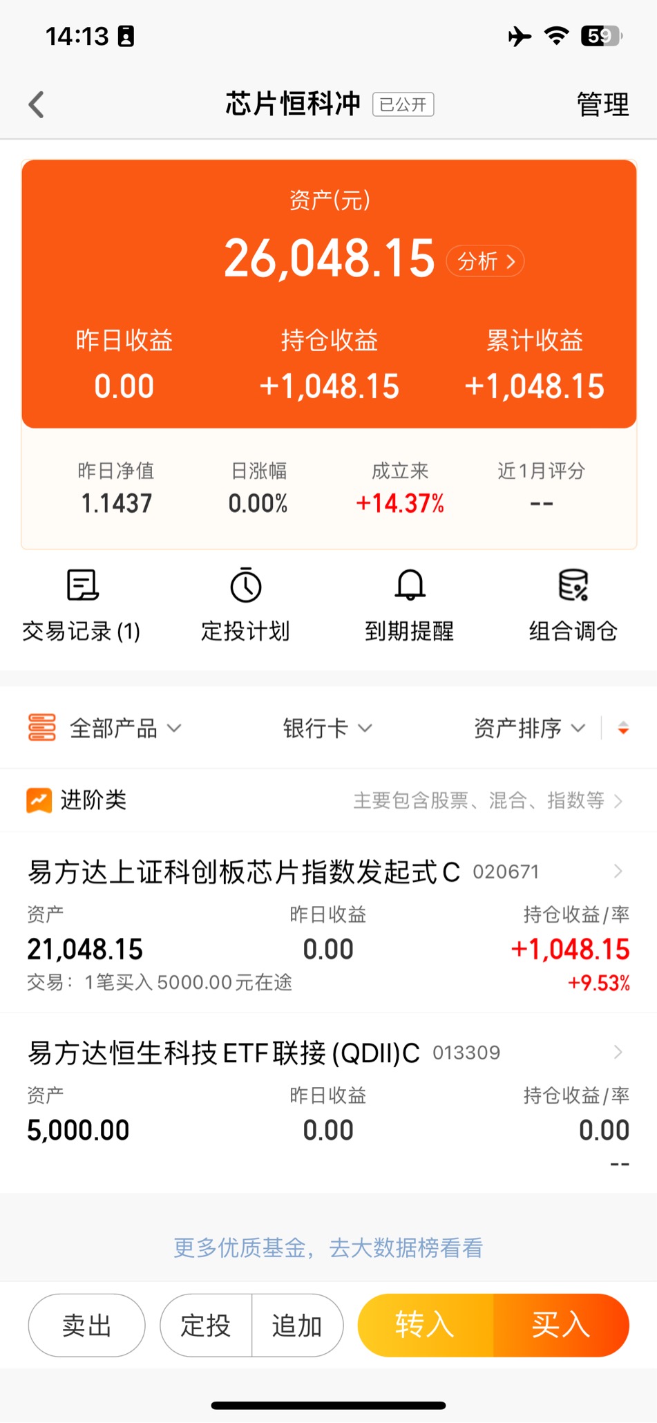 今日加仓5000元易方达科创芯片(020671),$易方达上证科创板芯片指数发起式C$ 选择易方达科创芯片,主要是因为相比同类来说,短期爆发力强,更贴近指数的涨幅,今日加完仓就满仓了,满仓安心过节,坐等节后继续吃肉。今天芯片估值微涨,热点让给了固态电池,因为有重大技术突破。但芯片的行情并没有就此结束,一来国产替代这一块持续有重大突破,二来无论是人型机器人、AI还是智能驾驶、可控核聚变、低空经济等等,全部都需要用到芯片,而且是国产芯片,整体需求增量空间很大,而产能不是马上能提上来的,所以我们看到近期多家芯片厂商提价。芯片基金我打算持有到年底,一般到这个时候,全面的主线不会有太大变化,机构资金要锁住自己的排名,不会随便调仓。