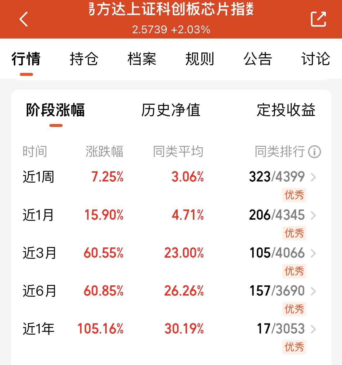 今天$易方达上证科创板芯片指数发起式C$ 表现挺亮眼!跟踪的科创芯片指数最新成交2.565元,涨了近2%。这基金持仓特实在,全是科创板芯片核心股,覆盖设计、设备、材料这些关键环节,“含芯量”超高。背后有AI算力需求和国产化替代撑着,板块业绩也在回暖,短期波动不怕,想布局芯片赛道的新手选它挺合适,门槛还低。