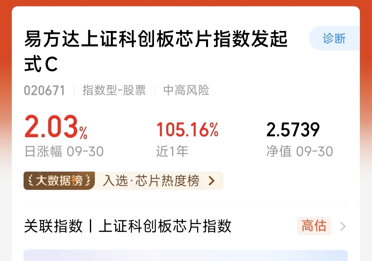市场迎来全面突破,芯片半导体的表现再次超出预期。全球芯片进入新一轮的上涨涨价周期。也带动了半导体板块的全面突破。$易方达上证科创板芯片指数发起式C$ 这只聚焦芯片的指数基金,紧跟上证科创板芯片指数。跟踪的精准度高。长期表现的非常不错。节前收官上涨了2.03%。近一年涨幅达到了105.16%。爆发力的表现是非常强的。而且遇到波动回撤控制的也是比较好,同赛道业绩长期都是领先。我非常看好在未来半导体行情中的成长表现。今天也开始布局了。