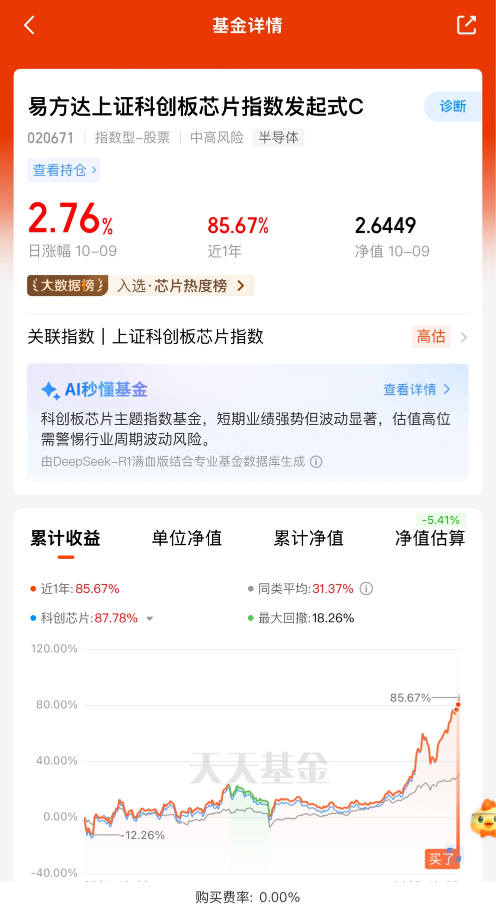 从业绩表现来看,$易方达上证科创板芯片指数发起式C$ 展现出持续领先优势,近1月涨幅33.10%、近3月涨幅69.90%、近6月涨幅74.27%收益率均大幅跑赢同类产品,凸显出该指数在芯片产业投资中的标杆地位。