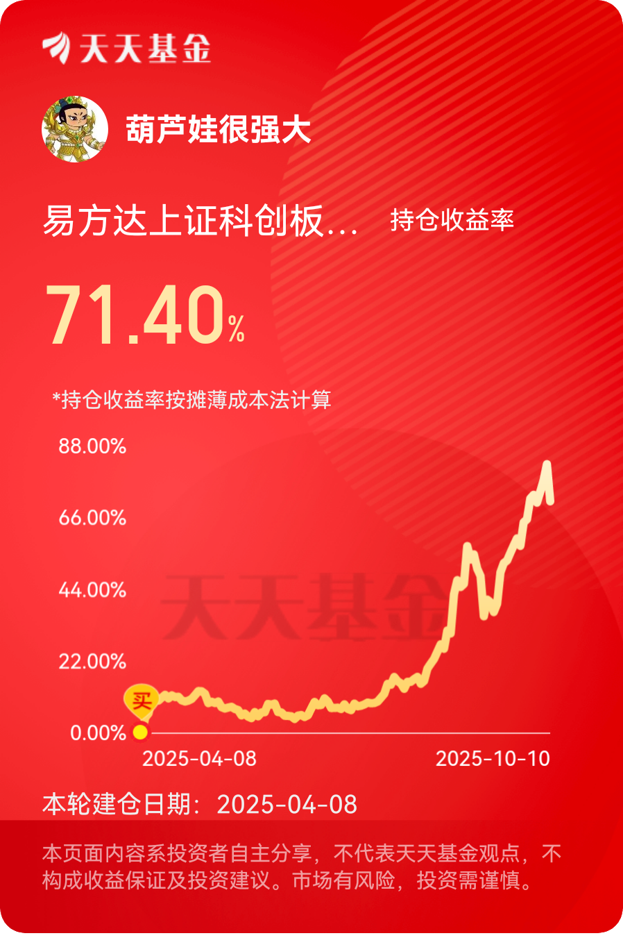 #分享国庆见闻,晒收益,瓜分好礼!##热点话茬# 我是科技派,难得这次上海的静安公园开发了一个新的景点,让全国各地的很多人都来打卡拍照,而我也不例外去了,这个景点与敦煌莫高窟很向,我已经去了三天,我看好芯片行业,我国已经把芯片行业放在战略的高度了。随着我国越来越重视高科技项目的建设,优秀的芯片公司会不断涌现,因为芯片是很多高科技产品的“血液”,而且全球芯片市场的规模不断变大,因为现在人类很享受智能化的生活,而智能化又能使得数字化的设备得到更为广泛的应用,从而进一步提升芯片市场的规模。所以我持有的是易方达上证科创板芯片指数发起式C(020671),它也带给我很好的投资体验。@易方达基金