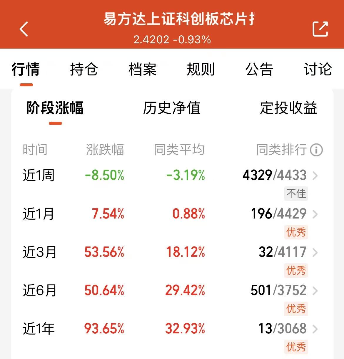 今天大盘又震荡了,低开低走,全市场仅有890只个股上涨的,不理想的盘面呀,芯片今天也小幅调整了,$易方达上证科创板芯片指数发起式C(OTCFUND|020671)$估值下跌2.57%,近三个月涨幅50.64%,近一年涨幅93.65%,长期业绩优秀,重仓有中芯国际、海光信息、寒武纪等龙头企业,我觉得后续也还会有人工智能热点催化,还有很大的上涨空间,我是继续看好未来前景的!