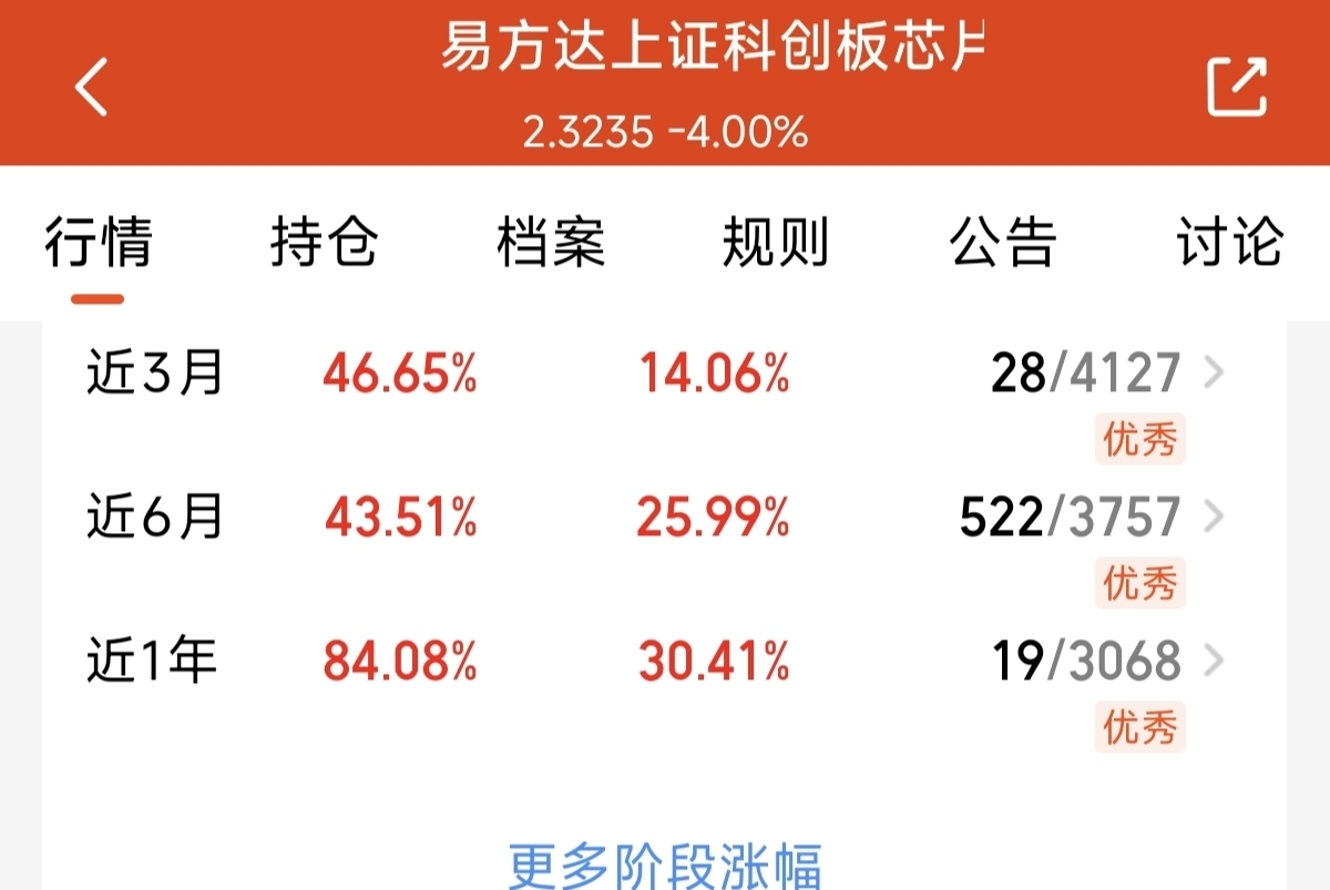 半导体果然还是主线。今天再次迎来全线反弹。$易方达上证科创板芯片指数发起式C$ 这是聚焦芯片的指数基金。今天估值已经上涨了2.86%。,紧跟上证科创板芯片指数。全面覆盖了芯片的上下游产业。近3月涨幅46.6%。同类芯片基金长期做到了优秀。当前半导体芯片业绩持续超预期。而且过程替代迎来再加速。四季度的表现值得期待。我继续保持布局。
