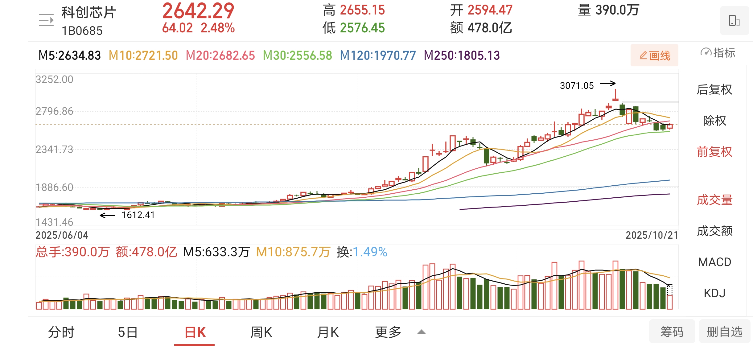 10月21日A股集体反弹,截止我发文时,上证指数涨1.20%,深证成指1.97%,创业板指涨2.92%。我一直看好的芯片半导体方向也迎来了强势反弹,上证科创板芯片指数(000685)今天目前涨2.48%。指数上周五下探至30天均线附近,昨天再次回踩这根均线获得了一定支撑,今天指数终于踩着这根均线反弹,走出一根实体阳线,收复了5天均线。我认为这是初步的止跌反弹信号。主升浪中,出现回调至关键均线获得有效支撑,是非常不错的进场点。