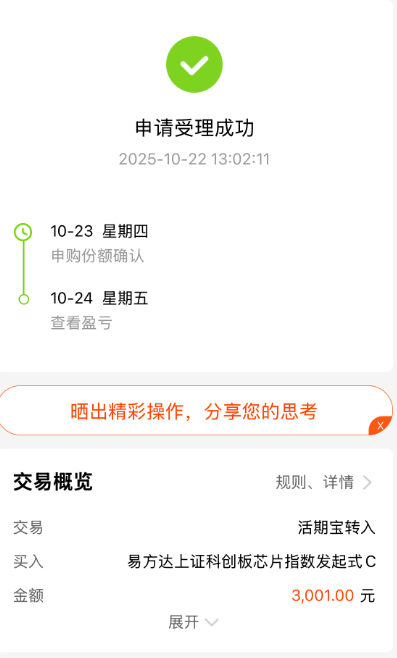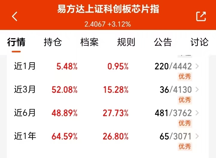 选择对应主题基金时,业绩表现是核心考量。$易方达上证科创板芯片指数发起式C(OTCFUND|020671)$在各阶段行情中,近三个月上涨52.08%,近一年64.59%的额业绩涨幅均领先同类,能争取更多收益加成,我今天也布局一笔。
