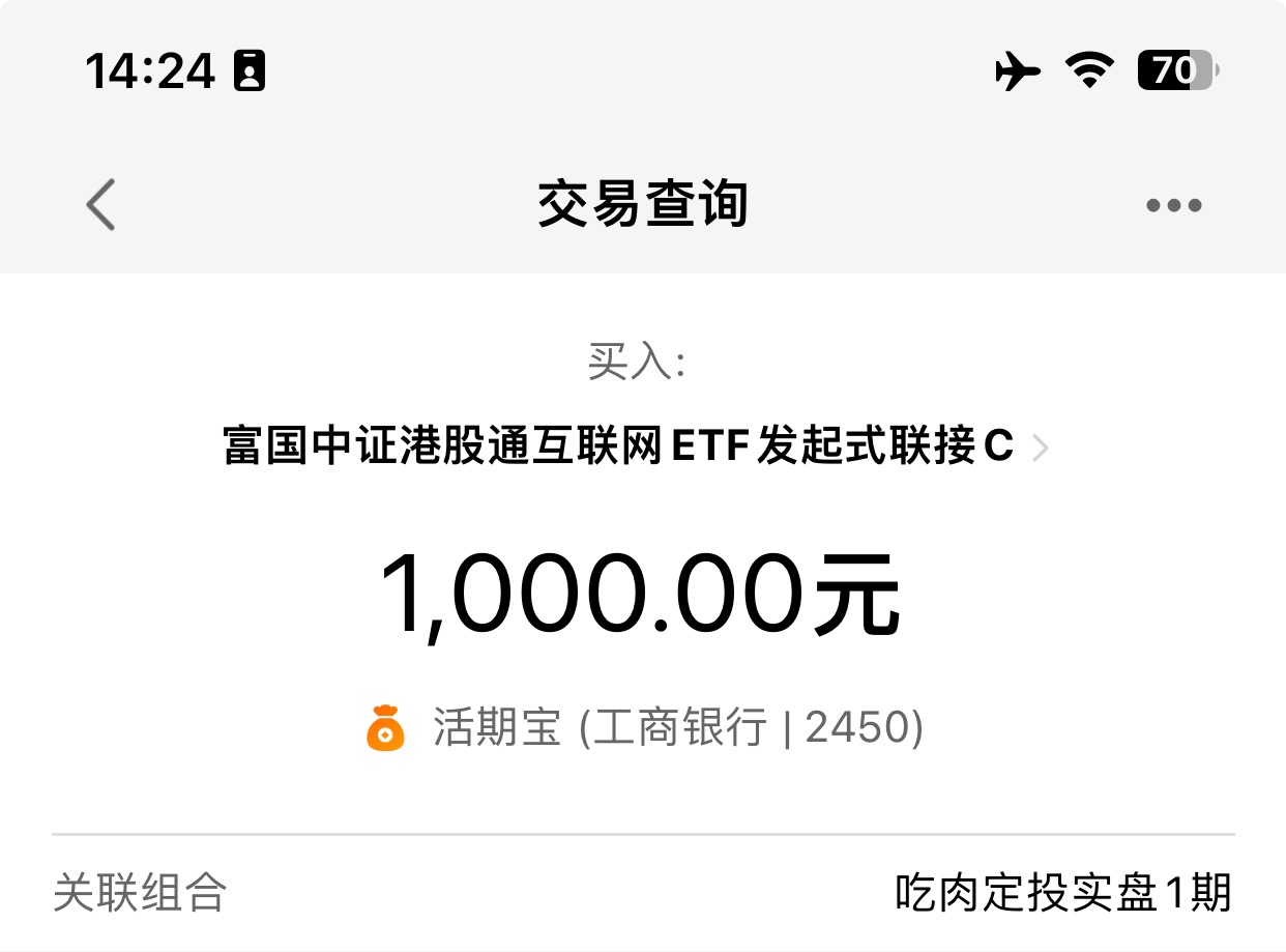 今日加仓1000元港股互联网(014674),$富国中证港股通互联网ETF发起式联接C$ 互联网昨晚美股涨挺好,今天本来涨得挺好的,港股被A股带下去了,中午那会突然有一波跳水。估值便宜、业绩不错、有回购、AI应用的预期也很好,就是缺少资金关注不能大涨,真的无语,我能做的就是不断捡便宜筹码,耐心等风来。