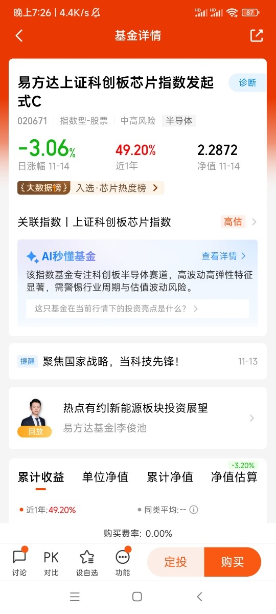 发帖第一天。11月14日,芯片板块震荡回调,科创芯片指数跌3.08%报2.267