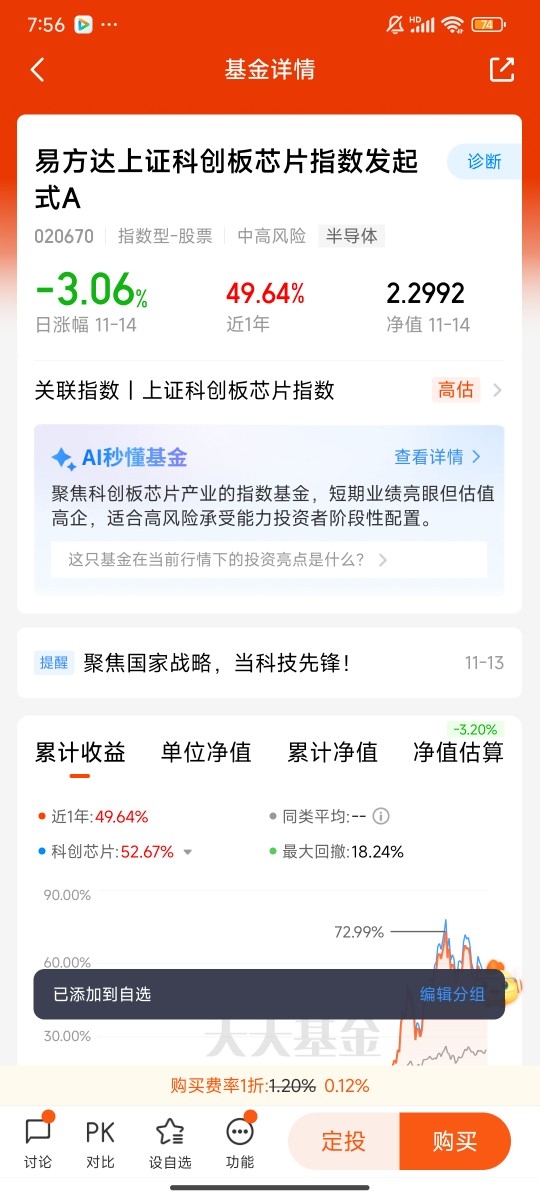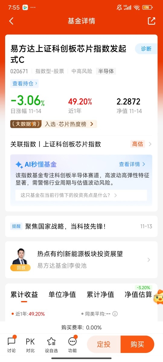 11月14日,这个周五注定要被钉在不少芯片投资者的记忆里——上证科创芯片指数单日暴跌3.2%,绿油油的K线像一盆冷水浇灭了一周的期待。我持有的易方达上证科创板芯片指数发起式C,也没能逃过这波调整,单日下跌3.06%,打开基金账户看到浮亏数字的那一刻,确实有种“吃大面”的苦涩。身边不少朋友都在吐槽“又被市场教育了”,甚至有人开始动摇要不要割肉离场,但我却异常平静,反而在盘算着下一波加仓的时机。因为在我看来,眼前的黑暗只是短期波动的阵痛,芯片赛道的长期光明从未熄灭,而这样的下跌,恰恰是低价捡筹码、增加基金份额的好机会。
