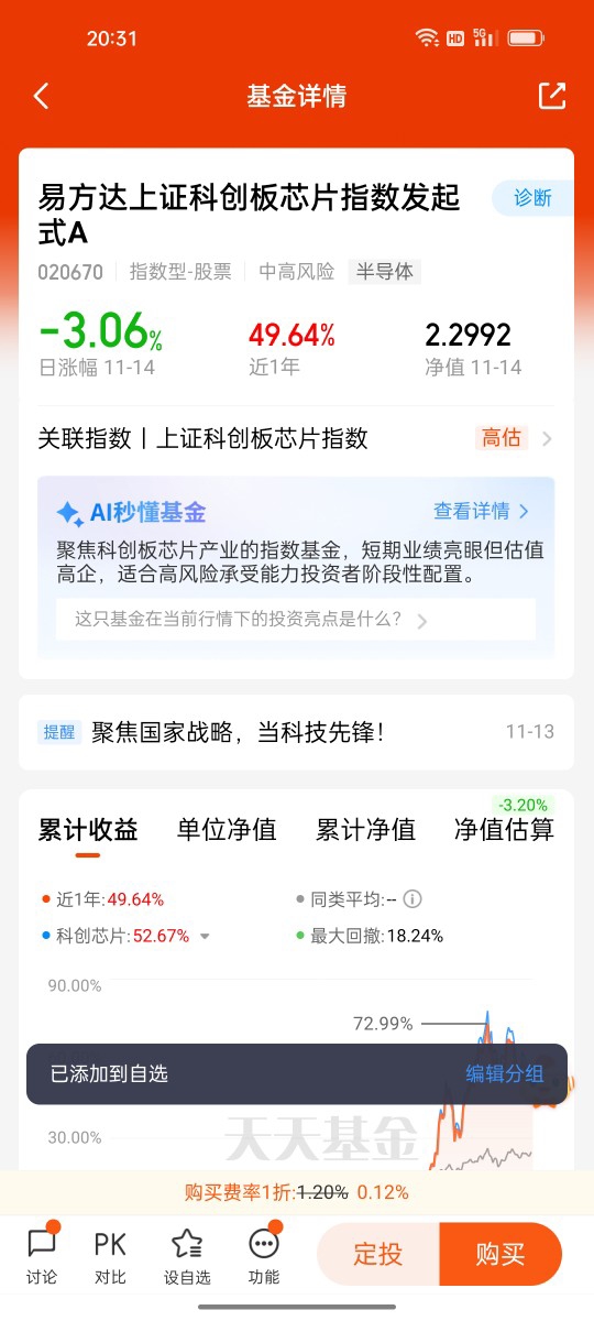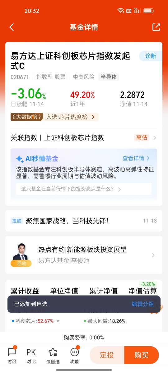 今日芯片板块分化中藏机遇,$易方达上证科创板芯片指数发起式A$今日跌3.06%,