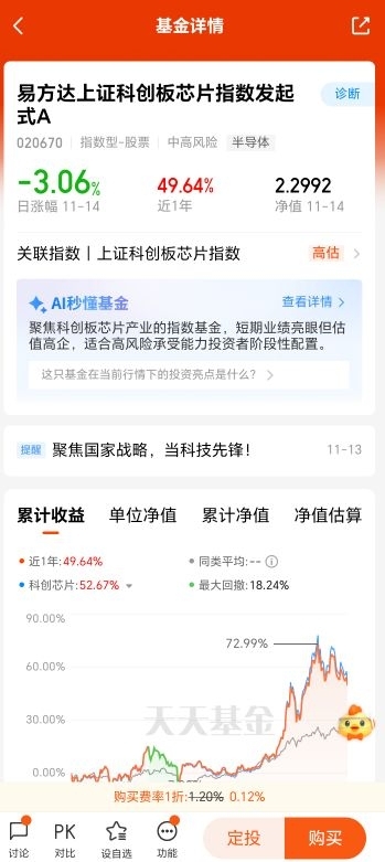 #观点搭子团火热招募中!# #热点话茬# 11月14日易方达上证科创板芯片指数发起式C日跌幅3.06%,虽短期回调,但近1年收益仍达49.20%,跑赢科创芯片指数(52.67%)的表现可圈可点。
