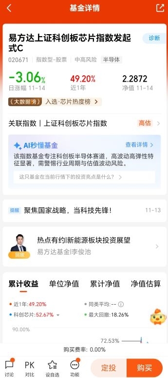 11月14日易方达上证科创板芯片指数发起式C日跌幅3.06%,虽短期回调,但近1