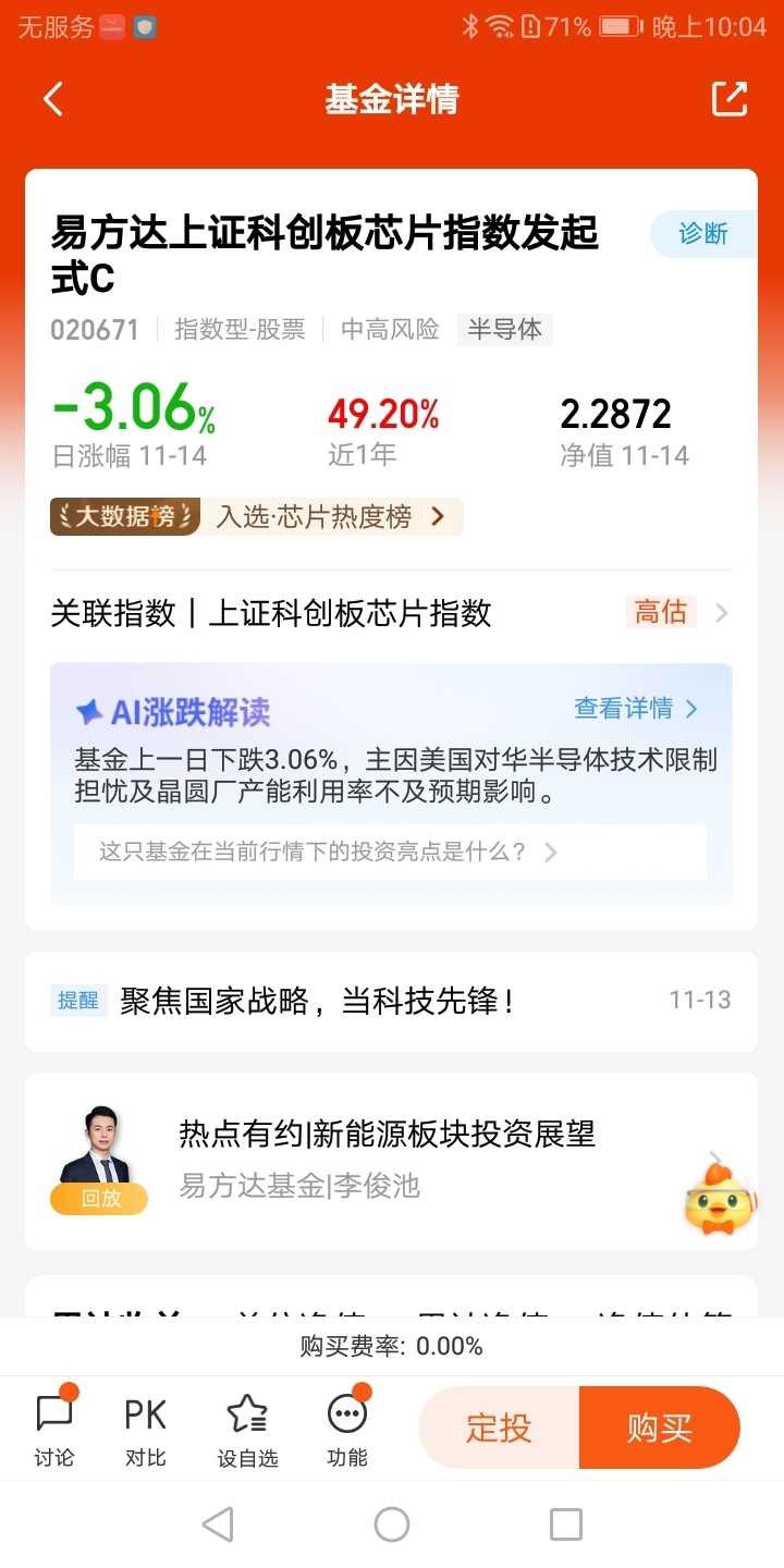 11月14日,今天芯片指数是下跌的,进入11月以来,芯片指数开始调整,但我依然看好芯片指数的未来,十五五会议提到下一个五年规划,重点提到了科技创新,芯片显然属于科技创新范畴内的,国产替代一直进行中,所以我对芯片指数未来是看好的,只要国家想搞就没有搞不好的。相信国运。$易方达上证科创板芯片指数发起式C$ @易方达基金