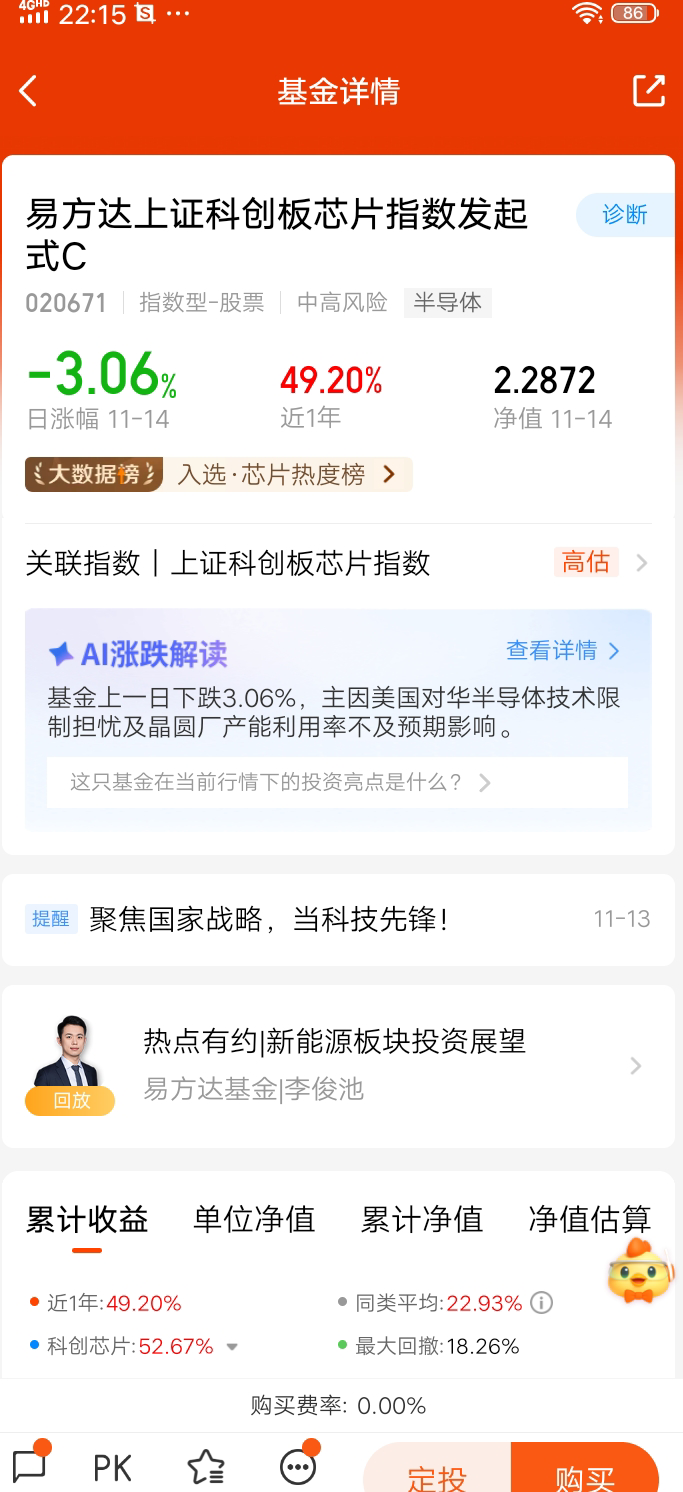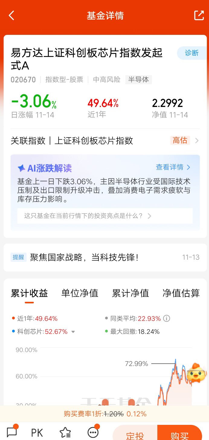 11月14日,芯片指数出现下跌,本周是四阴一阳,最近芯片指数跌的有点猛,近一月下跌5.17%。不过从长期看是上涨的。$易方达上证科创板芯片指数发起式C$ 近一年上涨49.20%。该基金经理李栩,从2024年1月31日管理该基金至今,已上涨135.94%。回报率相当惊人。芯片指数的爆发力还是相当大的。不到两年翻了一倍多,长期看好国产替代。@易方达基金