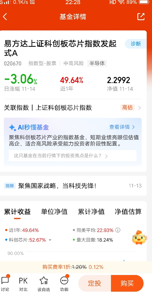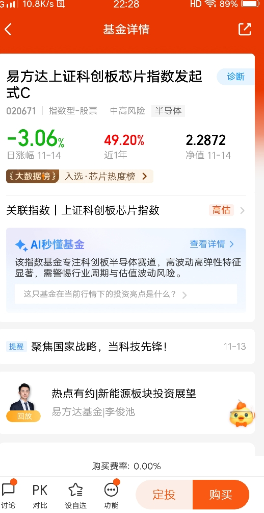 11月14日,今天$易方达上证科创板芯片指数发起式C$ 下跌了3.06%,但今年以来总体是上涨的,今年以来该基金已上涨50个点了,进入本月以来,科技相关板块都在调整,可能是今年涨幅有点大,所以有部分资金出于安全考虑,落袋为安,也有的资金转移到银行股避险。目前看上证科创板芯片指数还处于高估值状态,不过等四季报出来以后,估值有望重新评估。@易方达基金