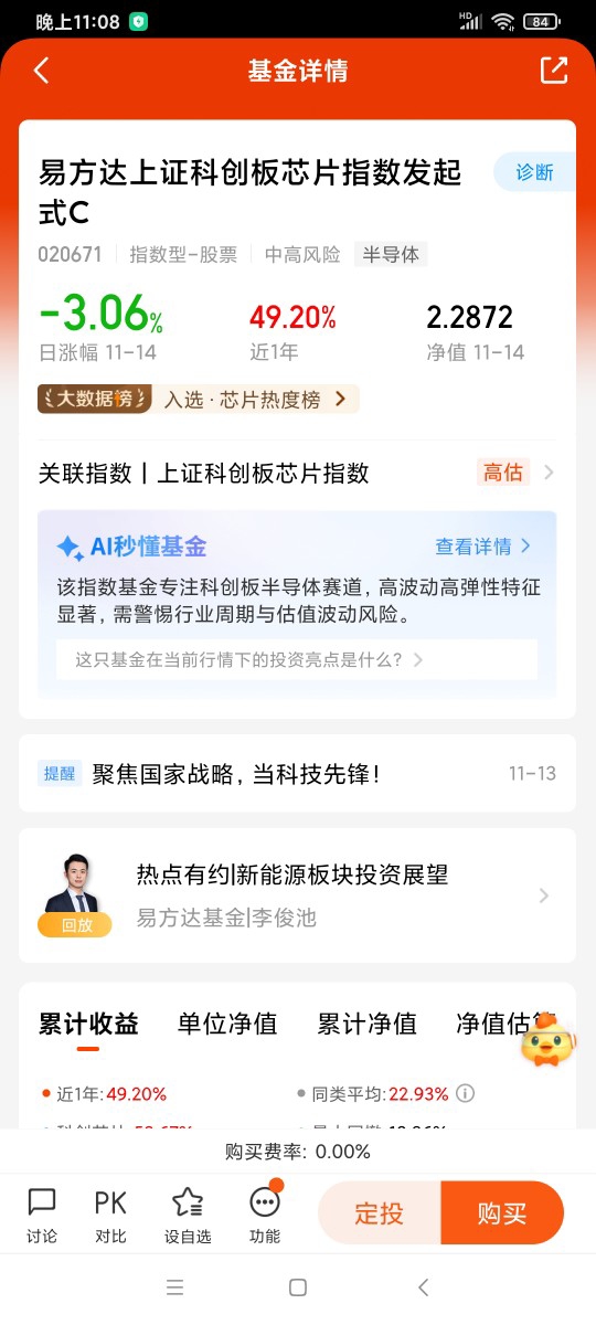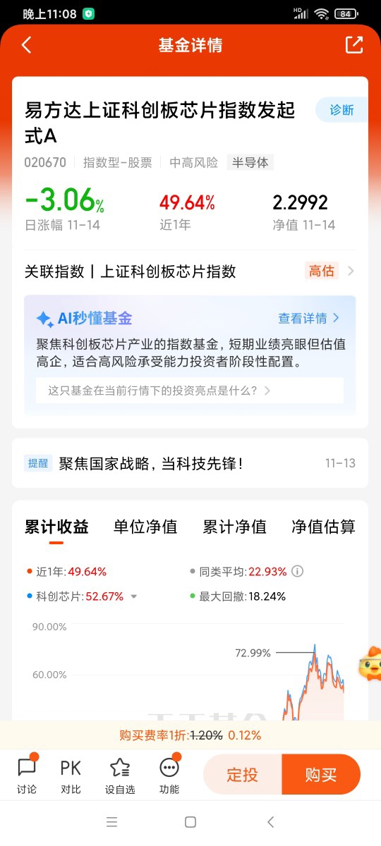 11月14日,受隔夜美股影响,今天市场普跌,$易方达上证科创板芯片指数发起式C$
