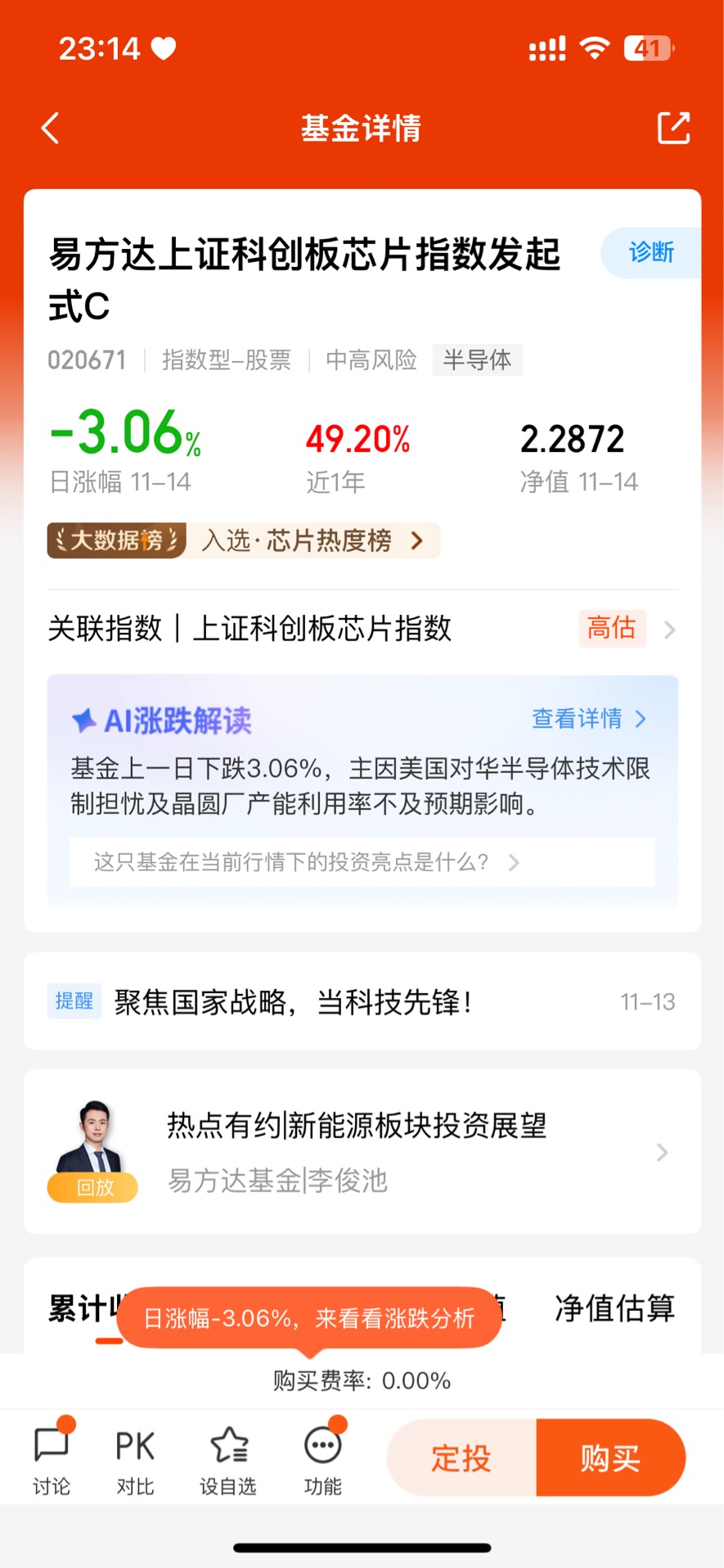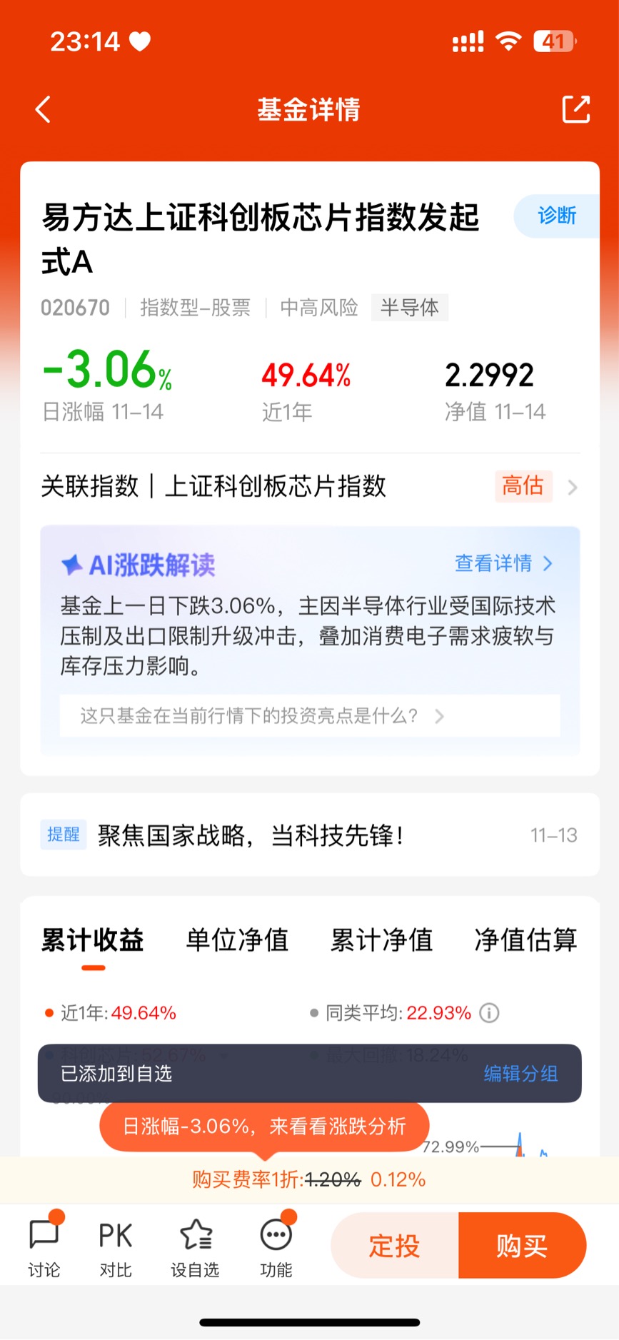 我持有的易方达上证科创板芯片指数发起式C,今天迎来明显回调,净值有所下滑。近期这只基金波动挺明显的,跟着芯片板块的节奏起起落落,属于中高风险基金的正常表现。