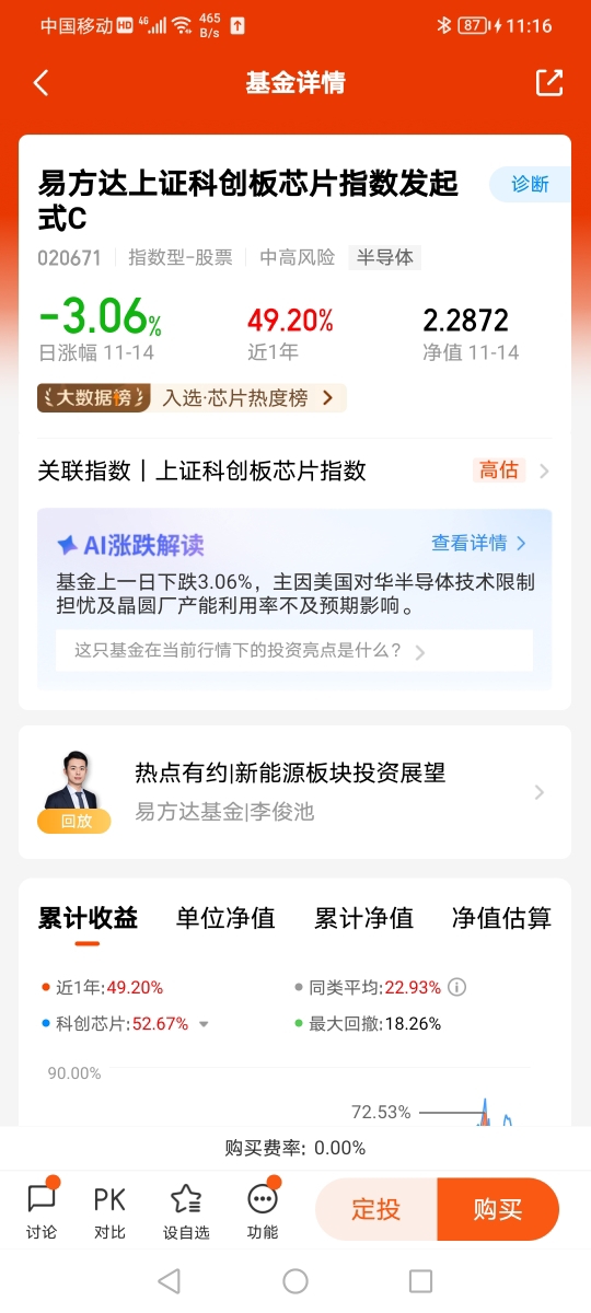 11月14日,今日$易方达上证科创板芯片指数发起式C$又回调了3%,从10月底高