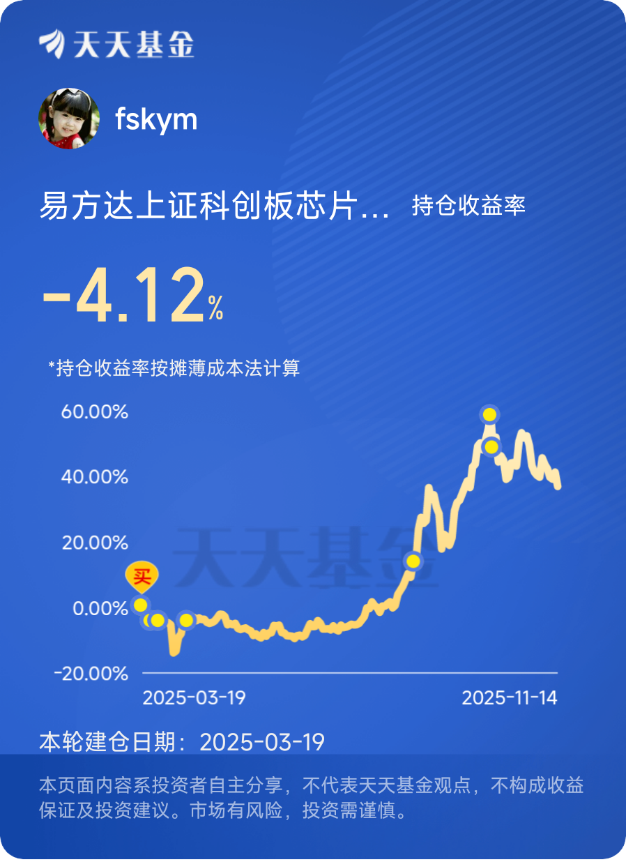 第一天打卡,11月14日,今日芯片板块下跌,$易方达上证科创板芯片指数发起式C$ 跌3.06%,机器人、半导体、芯片这些科技相关板块,简直是集体“下杀”不带含糊的,其实这波科技股下杀也不是没原因的,隔夜美股就已经“崩了”,纳指暴跌超2%,特斯拉、英特尔这些科技巨头带头大跌,恐慌情绪直接传到了A股 。再加上市场对美联储12月降息的预期降温,之前靠降息预期涨起来的高估值科技股,自然成了资金抛售的对象。还有就是AI板块之前涨太猛了,估值有点虚高,现在市场开始冷静下来,资金纷纷获利了结,也加剧了板块的下跌。但我认为慢牛依然没有结束,静待板块修复。@易方达基金