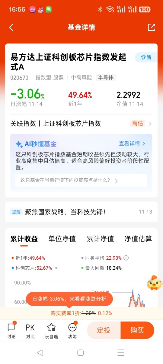 11月15日,第三篇,我的计划是趁这波调整,小额定投易方达科创板芯片C。理由是C