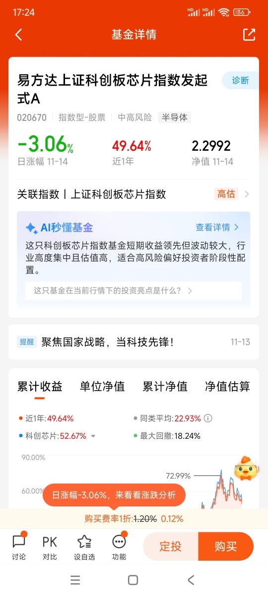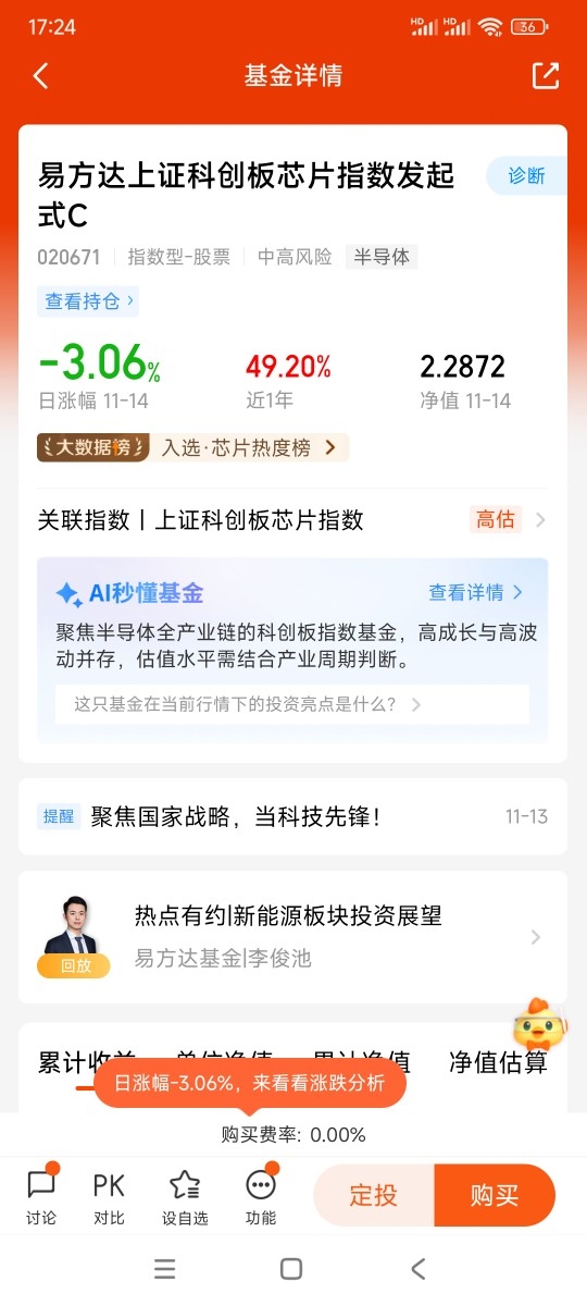 打卡第一天,11月14日,周五芯片板块暴跌,$易方达上证科创板芯片指数发起式C$