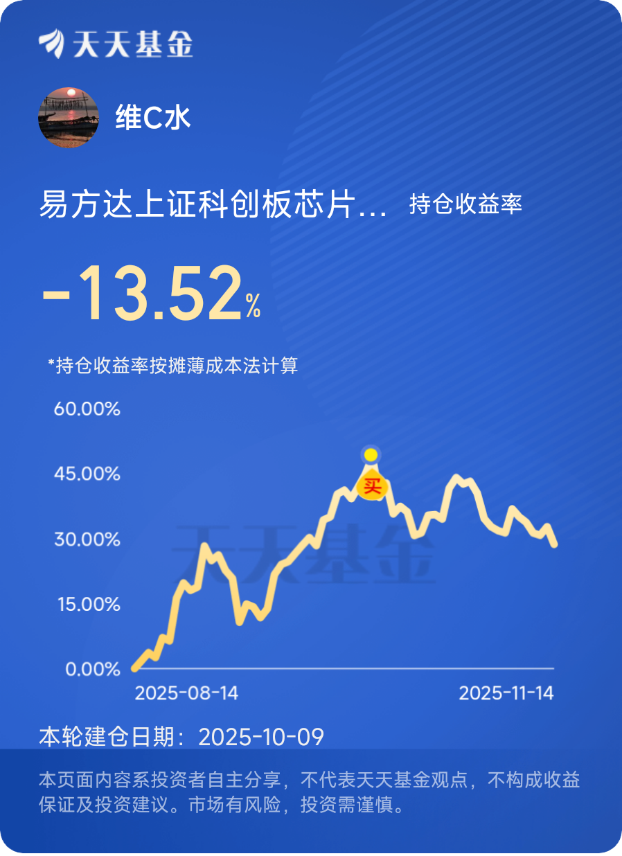 打卡第一天,11月14日,周五芯片板块暴跌,$易方达上证科创板芯片指数发起式C$ 跌3.06%,牛市的核心就是资金扎堆和情绪共振,得是一帮人拧成一股绳一起向前奔跑,回调就是在筛选“战友”,留下那些真正看好芯片行业长期价值、愿意陪着板块成长的投资者。只有把短线投机的浮筹清理干净,后面拉升的时候阻力才小,行情才能走得更稳、更远。那些被洗出去的人,大概率会看着芯片板块后面继续涨,然后忍不住又追高进来,最后反而成了接盘侠,这种“一卖就涨”的戏码,股市里还少吗?@易方达基金 #晒收益#