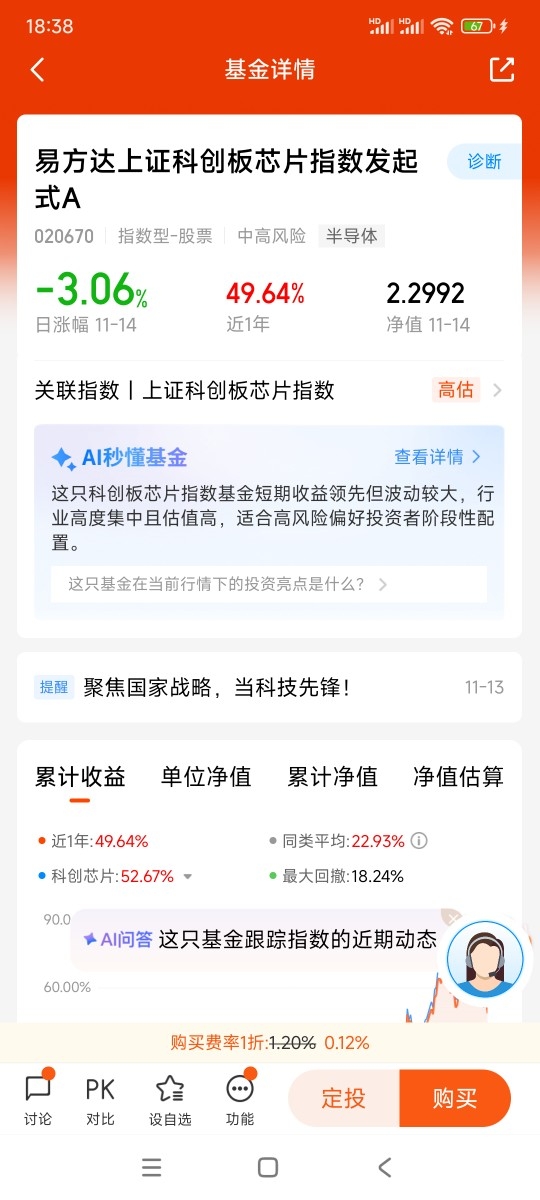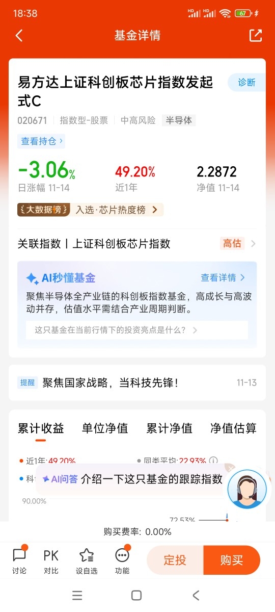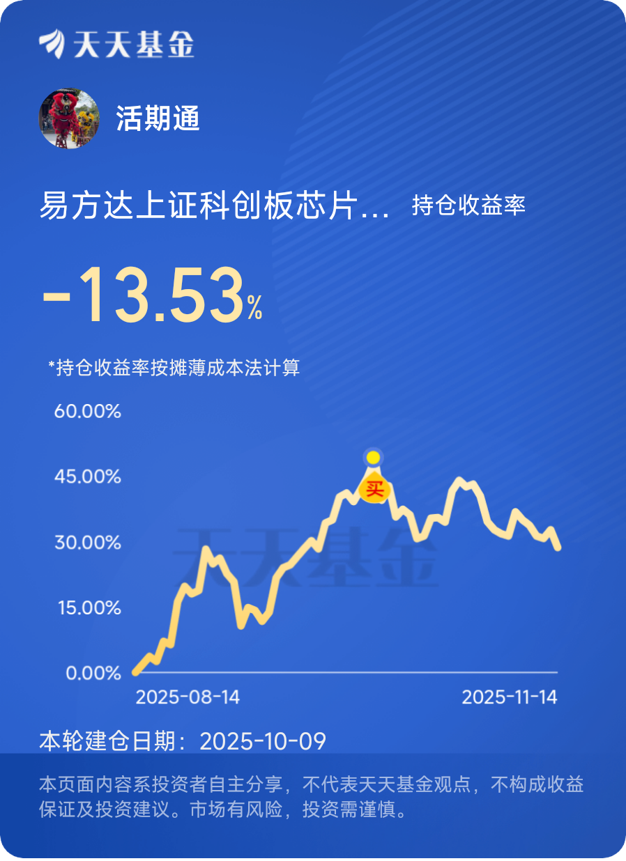 打卡第一天,11月14日芯片板块暴跌,$易方达上证科创板芯片指数发起式C$ 跌3.06%,我认为这回调不仅不是坏事,反而是绝对的好事,简直是给后续的牛市铺路,之前芯片板块涨得多疯啊,好多股短短一段时间就翻倍,甚至翻好几倍。这种涨法看着过瘾,但根本不扎实,就像盖房子没打地基,越往上盖越危险,牛市哪是靠猛冲猛涨堆出来的?那得一步一个脚印,慢慢往上走才行。之前涨太快,不光容易滋生泡沫,还会让市场心态变得浮躁,大家都想着赚快钱,这样根本不利于板块长期突破重围,更别说形成真正的牛市了,别被短期波动吓下车,芯片板块肯定能带着大家开启真正的牛市行情。@易方达基金