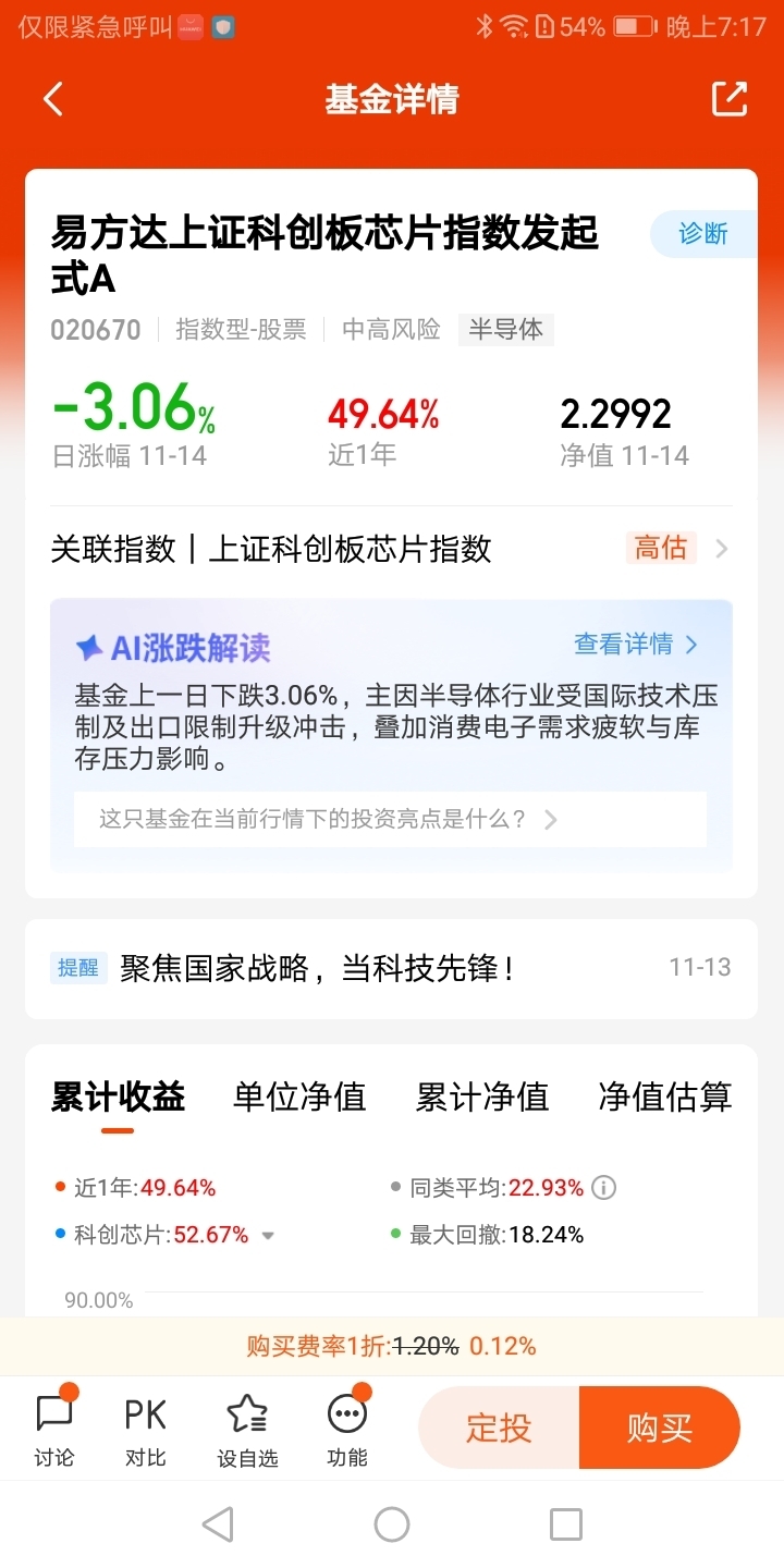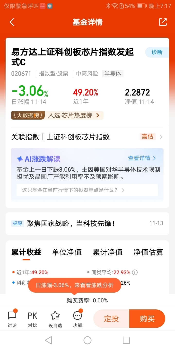11月15日,对于芯片板块我十分看好它未来的潜力,因为这个行业太关键了,十五五也提出了未来5到10年的发展方面,科技创新这个词排在第一位,也包含着高端芯片制造的技术突破,如果未来高端芯片可以自己制造,那我们的高端科技发展将会更快,所以我认为芯片的影响力很大,所以未来几年芯片行业也会有很大的发展潜力。$易方达上证科创板芯片指数发起式C$ @易方达基金