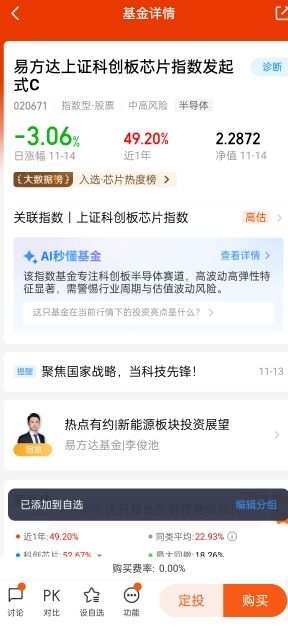存储芯片涨价周期与AI算力投资双重驱动下,芯片板块短期调整实属正常。11月14日$易方达上证科创板芯片指数发起式C$跟踪指数下跌3.06%,本周回调4.69%。此次波动主要受市场情绪影响,但行业基本面未变:AI芯片需求持续爆发,国产替代加速推进。该基金年内涨幅仍达51.62%,长期趋势稳固。当前回调,我已开启定投,把握芯片行业成长红利。