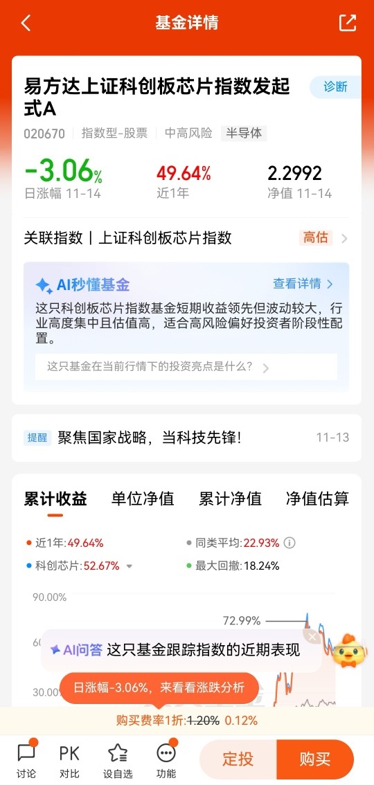 #观点搭子团火热招募中!# #热点话茬# 11月15日,周六休市,上周大科技板块继续承压回调,大部分压力来源于外围释放的AI泡沫论,不过我认为这反而会成为我们又一次低位布局的好机会,关税风波以来,我们看到了国产科技的自立自强,也看到了国产芯片所面临的困局,尽管关税加速的芯片产业链的发展,但空间时间都是不足够的,政策空间的加持之下,此时面临的充分回调能够减小产业的泡沫化的发生,从而为国产芯片带来更加健康的产业发展趋势,$易方达上证科创板芯片指数发起式C$ 为我们提供布局高弹性芯片产业场地,可以一观~@易方达基金
