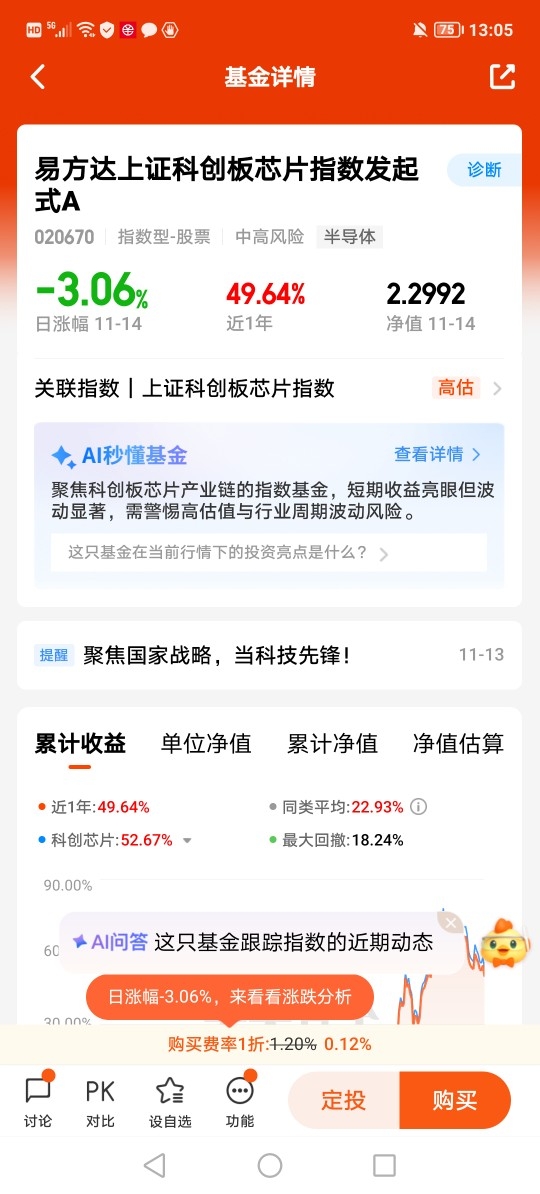#观点搭子团火热招募中!# #热点话茬# 11月16日,周日不开盘,本周总结下周计划,$易方达上证科创板芯片指数发起式C$ 近一周下跌4.69%,在科技板块中表现中规中矩,目前持仓浮亏不到6%,周五有加仓还没确认份额,对于下周行情不期待太多,但愿不要再调整下跌5个点以上,可以维持窄幅震荡调整,我会继续低吸布局,做好长投准备。@易方达基金